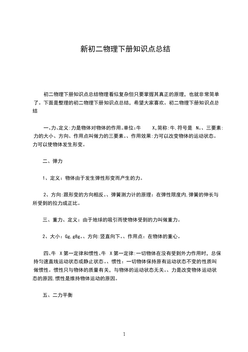 一、力、定义:力是物体对物体的作用。单位:牛X,简称:牛,符号是N。、三要素:力的大小、方向、作用点叫做力的三要素。、作用效果:力可以改变物体的运动状态。力可以使物体发生形变。