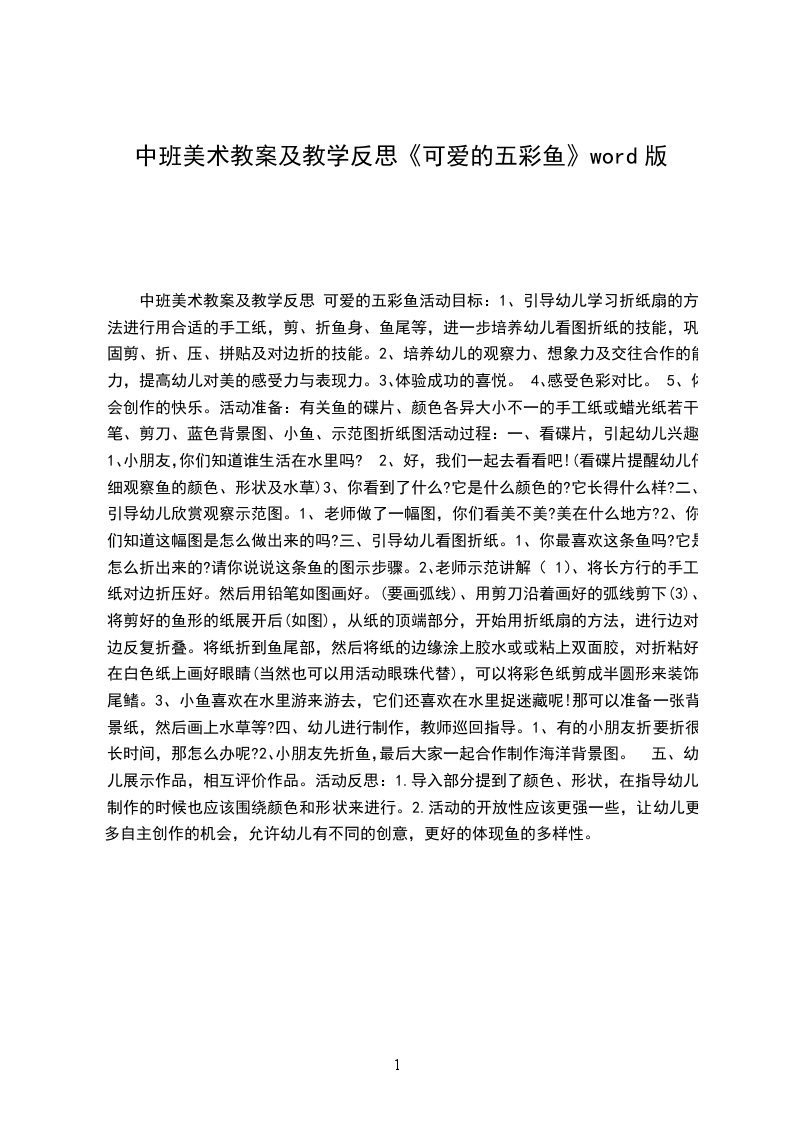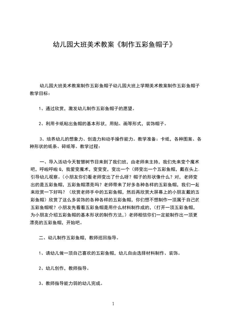 一、导入活动今天智慧树节目来到了我们班,由老师来主持,我们先来变个魔术吧,呼啦呼啦Q,我爱变魔术,变变变,变出一个(师变出一个五彩鱼帽,戴在头上。)引导幼儿观察。(小朋友你们看老师变出了什么呀帽子的形状像什么对,老师变出的是五彩鱼帽,五彩鱼帽漂亮吗老师带来了好多各种各样的五彩鱼帽,我们一起来欣赏一下好吗(欣赏老师手中的五彩鱼帽,然后再欣赏大屏幕上的小朋友戴的五彩鱼帽)欣赏了这么多装饰的各种各样的五彩鱼帽,你们想不想制作一顶属于自己的五彩鱼帽呢小朋友先看看五彩鱼帽是用什么材料制作成的,(打开一顶五彩鱼帽,为小朋友介绍五彩鱼帽的基本形状的制作方法,)老师相信你们一定能制作出一顶更漂亮的五彩鱼帽,开始吧。