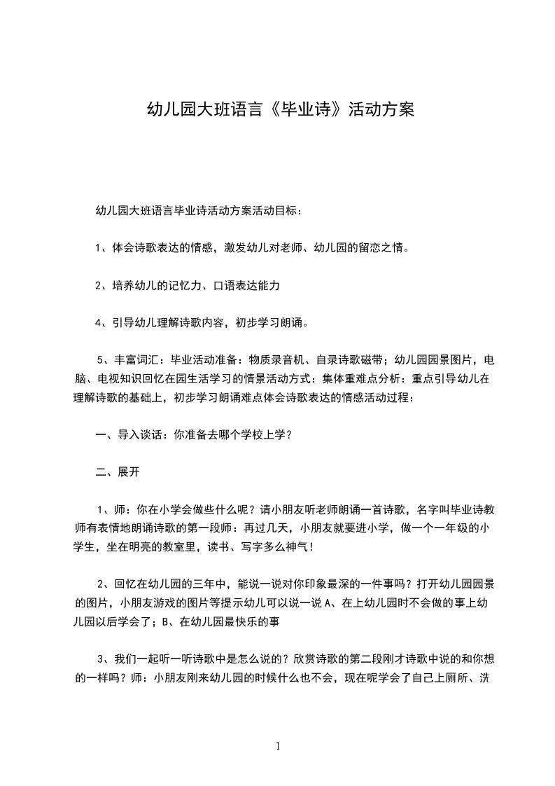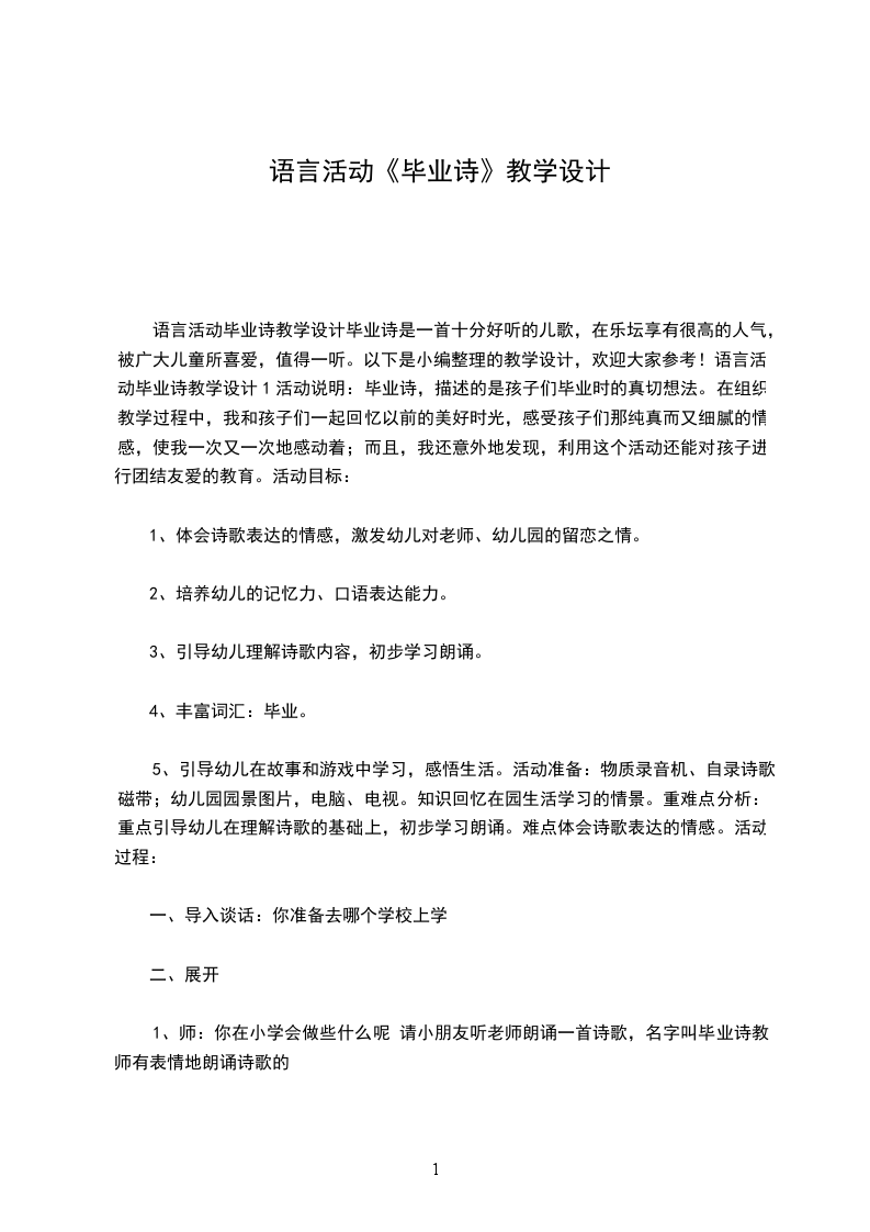 语言活动毕业诗教学设计毕业诗是一首十分好听的儿歌,在乐坛享有很高的人气,被广大儿童所喜爱,值得一听。以下是小编整理的教学设计,欢迎大家参考!语言活动毕业诗教学设计1活动说明:毕业诗,描述的是孩子们毕业时的真切想法。在组织教学过程中,我和孩子们一起回忆以前的美好时光,感受孩子们那纯真而又细腻的情感,使我一次又一次地感动着;而且,我还意外地发现,利用这个活动还能对孩子进行团结友爱的教育。活动目标: