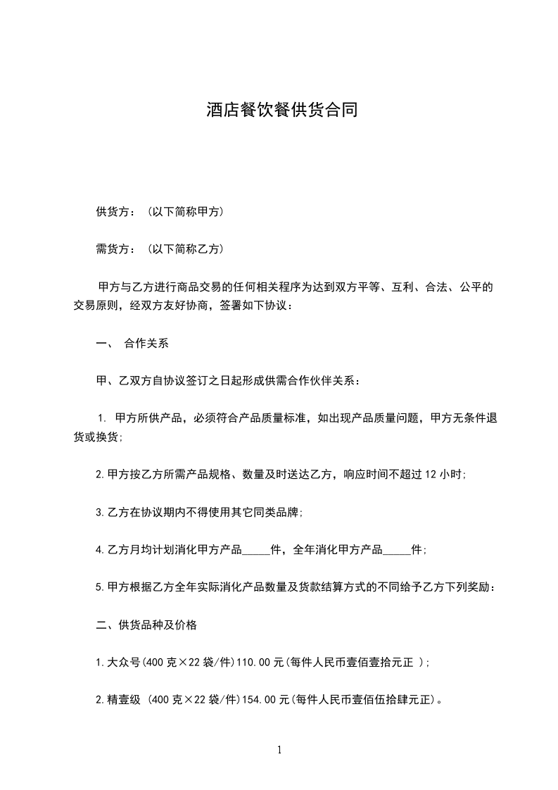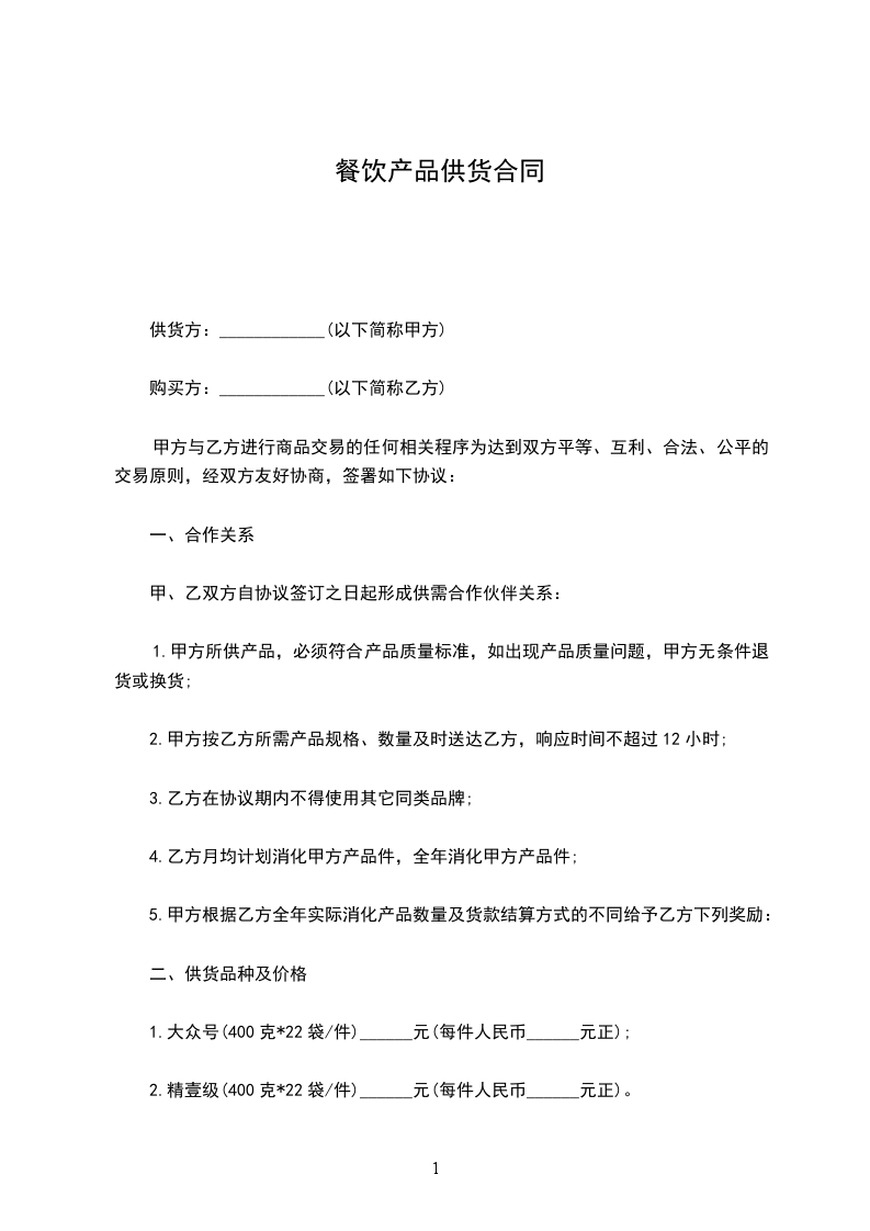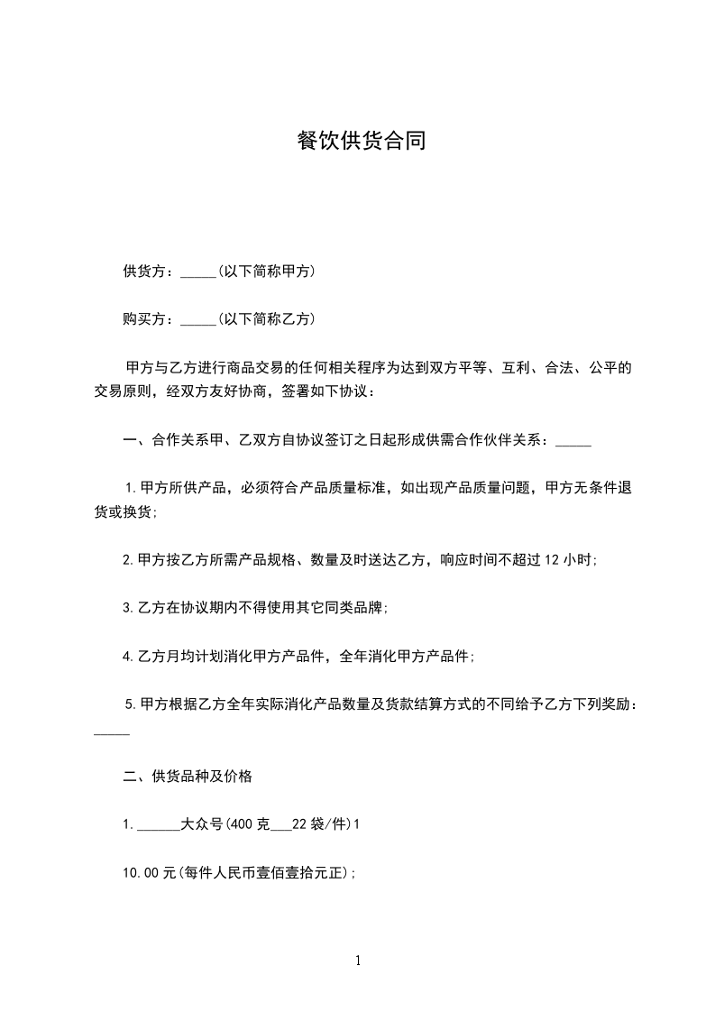 甲方:乙方:日期:用户指南:该协议资料适用于通过合同的订立和履行所要达到的最终目标,并且明确双方的权利和义务,便于保护当事人的正当利益,实现有效地约束当事人的行为,保证利益方(集体或个人)的合法权益不受损害。可通过修改使用,也可以直接沿用本模板进行快速编辑。甲方:(以下简称甲方)乙方:(以下简称乙方)依据中华人民共和国合同法以及有关法律、法规的规定,甲乙双方就甲方饭店所需的食品原料供应达成如下协议,以供双方共同遵照执行。