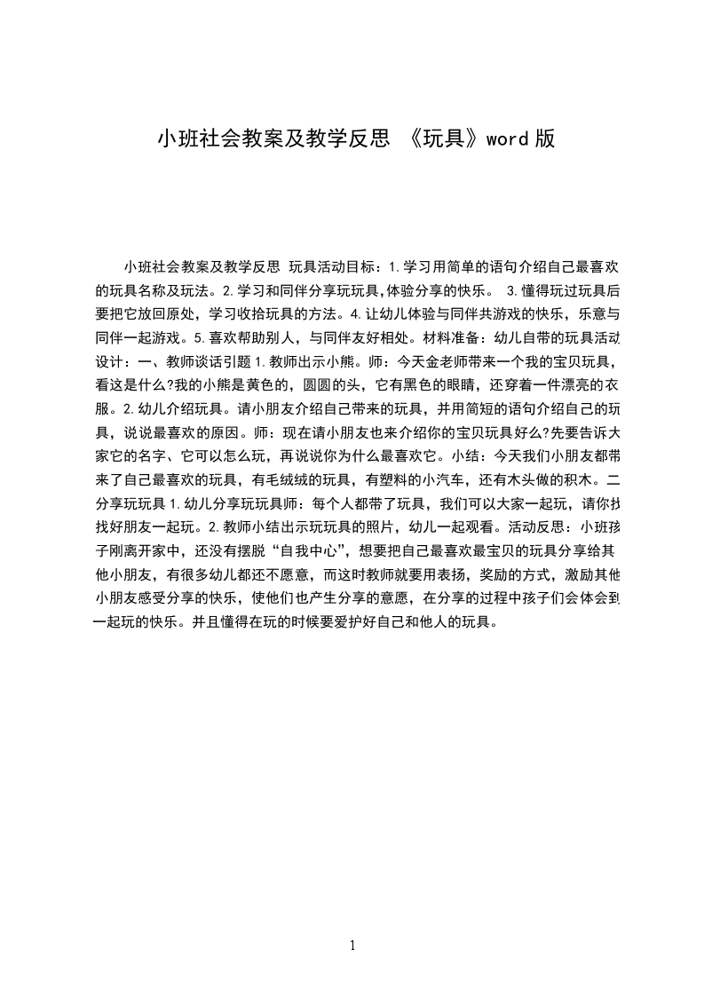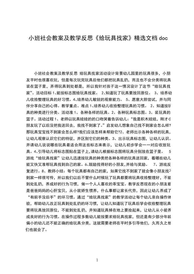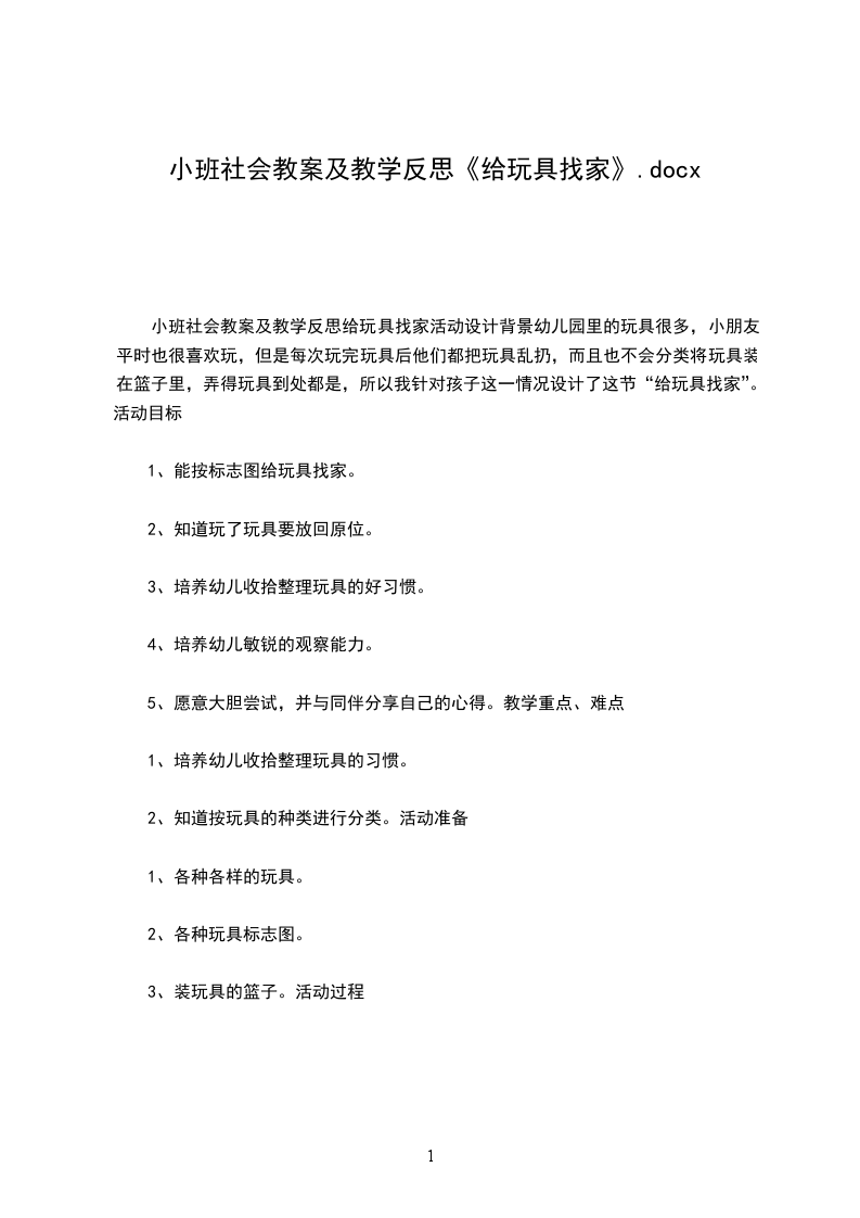 小班社会教案及教学反思给玩具找家活动设计背景幼儿园里的玩具很多,小朋友平时也很喜欢玩,但是每次玩完玩具后他们都把玩具乱扔,而且也不会分类将玩具装在篮子里,弄得玩具到处都是,所以我针对孩子这一情况设计了这节“给玩具找家”。活动目标