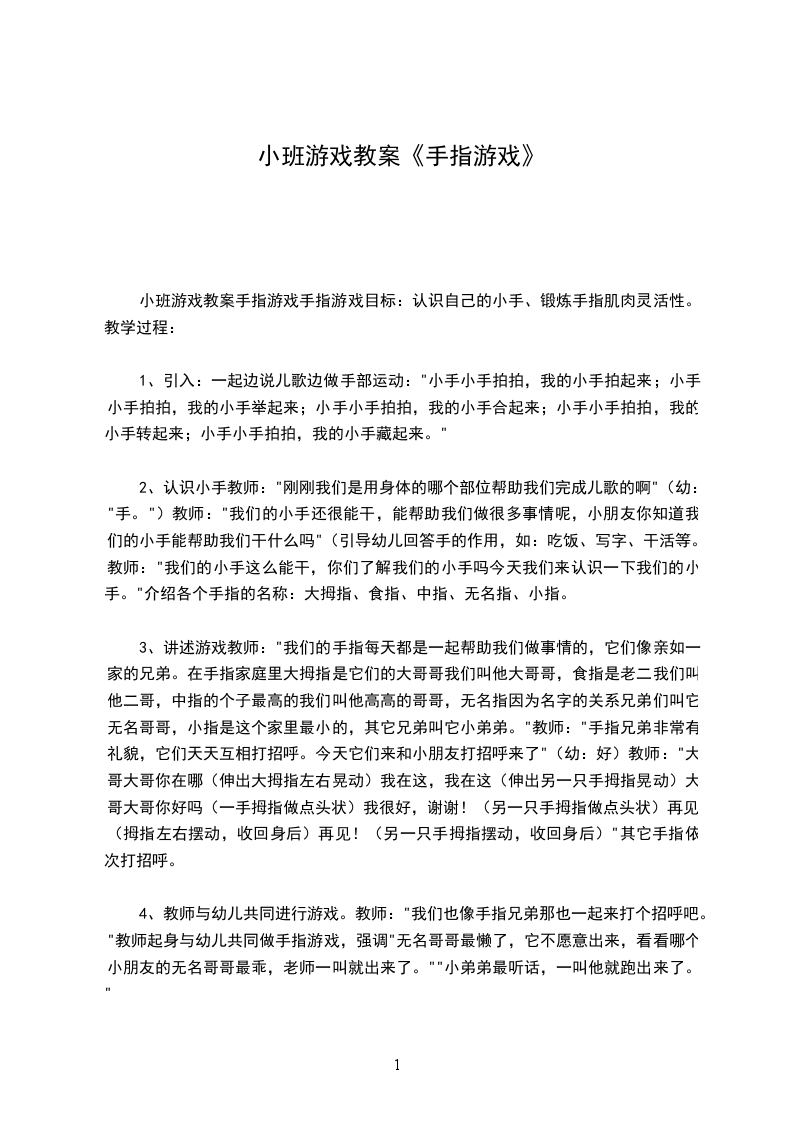 小班游戏教案手指游戏手指游戏目标:认识自己的小手、锻炼手指肌肉灵活性。教学过程: