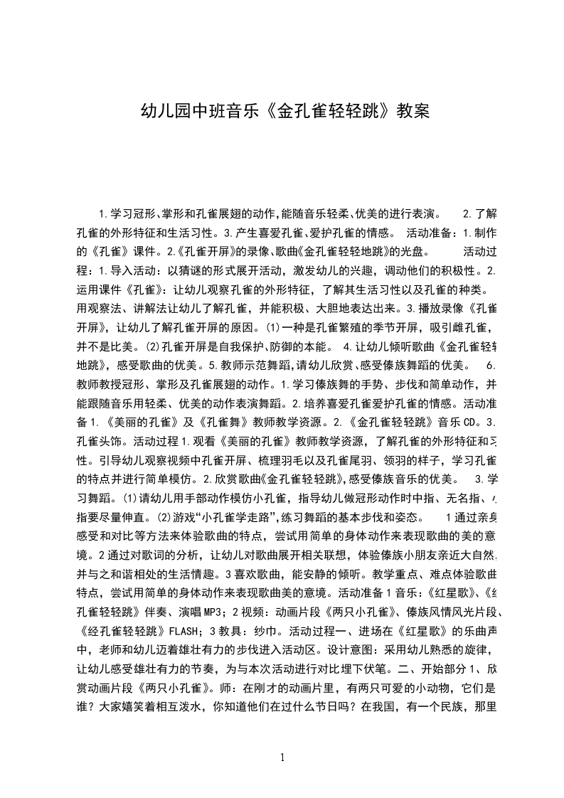 四、 拓展延伸邀请在场的老师共跳孔雀舞。师:小朋友们,今天我们一起走进了傣家,感受了傣家风情,还欣了一首非常优美的傣族歌曲金孔雀轻轻跳,老师希望你们能爱护我们的大自然,让美丽的孔雀健康快乐的生活!让我们载歌载舞,共同度过这美好的时光!设计意图:注重提高幼儿的人文素养,渗透热爱大自然、保护动物的意识。用舞蹈的形式将课堂气氛推向,让幼儿充分体验到欣歌曲的快乐和愉悦。教学反思这是一节大班的音乐欣活动金孔雀轻轻跳,在本次活动中,小朋友表现得特别棒,不仅较好的用语言表达出了对歌曲特点的理解,还能够用肢体动作来体现歌曲的美的意境。活动中,我以小朋友非常喜欢的动画片的形式导入活动,激发了幼儿的学习兴趣。在乐曲欣环节,我采用了歌曲对比和利用纱巾亲身感受两种方法来让幼儿体验乐曲旋律的轻、柔、慢。比较有效的帮助大部分幼儿说出了乐曲特点,避免了上次试讲时幼儿感受到了但表达不出来的问题。在歌曲欣环节,我采用了由“点”到“面”层层深入的方式,让幼儿感受歌词的美,鼓励幼儿大胆想象。并利用动画视频将孔雀与小朋友一起跳舞的欢快场面展现出来,生动形象。较好的达到了教学目标。最后的拓展延伸环节,注重提高幼儿的人文素养,用舞蹈的形式将课堂气氛推向,让幼儿充分体验到欣歌曲的快乐和愉悦。本次活动还是存在一些问题,如在歌曲欣环节,由于借班上课,我忽略了幼儿对歌词很陌生这个细节,幼儿在听一遍后基本都无法回答老师的提问,虽然也灵活的加入了清唱和教唱,幼儿也基本说出了歌曲内容,但感觉比较困难,可以尝试改变提问方式或分两课时进行。本次活动与以往活动相比的亮点:本次活动利用了多媒体动画,生动形象,比起以前欣教学中运用的图片和口头讲述,幼儿的积极性得到了极大的提高。在引入部分,我经过了多次修改,最开始为了活跃课堂气氛,采用了音乐游戏“快慢走”,但发现气氛是比较活跃,对歌曲旋律的体验也有一定帮助,但根本没有达到创设情境的目的;经过修改,我把引入部分改为了倾听“大自然的声音”,准备让幼儿通过倾听来创设情境,试上后我发现对于才刚刚升上大班的幼儿来说,通过倾听比较抽象的声音来感受情境比较困难,大部分的幼儿都不能感受和体验。经过思考,我改用幼儿都非常喜欢的动画形式导入,直观形象,为创设生动形象的情境,取得了比较理想的效果。小百科:孔雀仅2属3种。孔雀属包括2种,全长达2米以上,其中尾屏约1.5米,为鸡形目体型最大者。头顶翠绿,羽冠蓝绿而呈尖形;尾上覆羽特别长,形成尾屏,鲜艳美丽;真正的尾羽很短,呈黑褐色。雌鸟无尾屏,羽色暗褐而多杂斑。