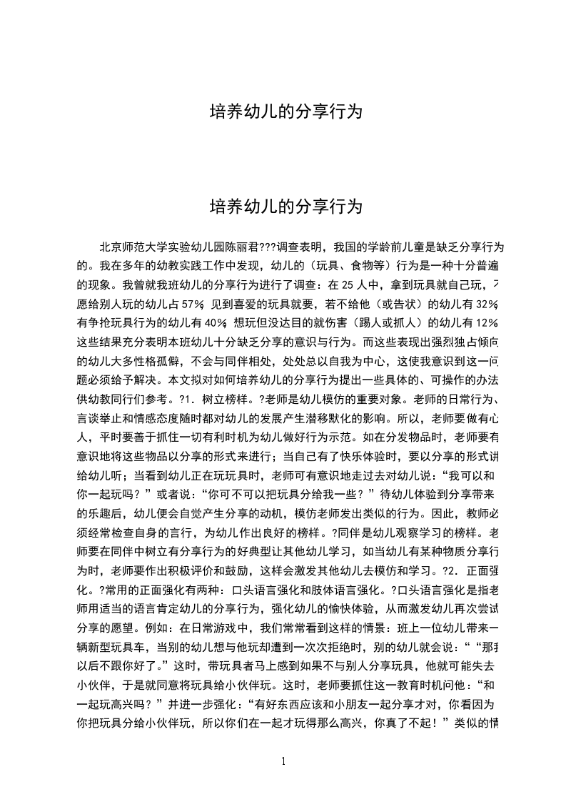 北京师范大学实验幼儿园陈丽君???调查表明,我国的学龄前儿童是缺乏分享行为的。我在多年的幼教实践工作中发现,幼儿的(玩具、食物等)行为是一种十分普遍的现象。我曾就我班幼儿的分享行为进行了调查:在25人中,拿到玩具就自己玩,不愿给别人玩的幼儿占57%;见到喜爱的玩具就要,若不给他(或告状)的幼儿有32%;有争抢玩具行为的幼儿有40%;想玩但没达目的就伤害(踢人或抓人)的幼儿有12%。这些结果充分表明本班幼儿十分缺乏分享的意识与行为。而这些表现出强烈独占倾向的幼儿大多性格孤僻,不会与同伴相处,处处总以自我为中心,这使我意识到这一问题必须给予解决。本文拟对如何培养幼儿的分享行为提出一些具体的、可操作的办法,供幼教同行们参考。?1.树立榜样。?老师是幼儿模仿的重要对象。老师的日常行为、言谈举止和情感态度随时都对幼儿的发展产生潜移默化的影响。所以,老师要做有心人,平时要善于抓住一切有利时机为幼儿做好行为示范。如在分发物品时,老师要有意识地将这些物品以分享的形式来进行;当自己有了快乐体验时,要以分享的形式讲给幼儿听;当看到幼儿正在玩玩具时,老师可有意识地走过去对幼儿说:“我可以和你一起玩吗?”或者说:“你可不可以把玩具分给我一些?”待幼儿体验到分享带来的乐趣后,幼儿便会自觉产生分享的动机,模仿老师发出类似的行为。因此,教师必须经常检查自身的言行,为幼儿作出良好的榜样。?同伴是幼儿观察学习的榜样。老师要在同伴中树立有分享行为的好典型让其他幼儿学习,如当幼儿有某种物质分享行为时,老师要作出积极评价和鼓励,这样会激发其他幼儿去模仿和学习。?2.正面强化。?常用的正面强化有两种:口头语言强化和肢体语言强化。?口头语言强化是指老师用适当的语言肯定幼儿的分享行为,强化幼儿的愉快体验,从而激发幼儿再次尝试分享的愿望。例如:在日常游戏中,我们常常看到这样的情景:班上一位幼儿带来一辆新型玩具车,当别的幼儿想与他玩却遭到一次次拒绝时,别的幼儿就会说:““那我以后不跟你好了。”这时,带玩具者马上感到如果不与别人分享玩具,他就可能失去小伙伴,于是就同意将玩具给小伙伴玩。这时,老师要抓住这一教育时机问他:“和一起玩高兴吗?”并进一步强化:“有好东西应该和小朋友一起分享才对,你看因为你把玩具分给小伙伴玩,所以你们在一起才玩得那么高兴,你真了不起!”类似的情景发生后,如果老师都能注意及时强化,幼儿在今后就会自觉产生分享的动机和行为。但老师在评价时要注意语气、语调,强化时要重点针对行为本身而不是针对本人,这样幼儿才能产生积极的分享行为。?肢体语言强化是指教师运用自己的动作、表情、眼神、姿态等变化来表达对幼儿分享行为的肯定。如当发现幼儿有分享行为时,老师可采取向幼儿点头、微笑、竖起大拇指或用手轻轻抚拍其肩、头等方式,使幼儿因得到老师的肯定而带来快乐和满足,从而在今后更愿发生类似的行为。?以上做法,不仅能使幼儿得到正确、适当、长效、深刻的行为强化,同时还有助于幼儿学会注意、体会别人的情绪情感,有助于幼儿社会情感认知的培养。?3.创造分享机会。?①设立“分享日”:是指老师根据实际情况在一周中设立一个专门的分享日。比如,“玩具分享日”是让幼儿在这一天将自己喜爱的玩具、宠物带来与别人分享。再如,“经验分享日”是幼儿在这一天,将自己的成功经验和近期完成的作品向他人展示,幼儿在展示和讲述的过程中,既能产生一种成就感,又会产生一种因分享带来的快乐和满足感,还可锻炼他们的口语表达能力。?②举办“生日会”:当某个幼儿有办“生日会”的需求时,我们可以与家长配合把“生日会”办成一个“分享会”。在“生日会”上,蛋糕、饮料、糖果等将成为小朋友共同分享的物品。老师在主持“生日会”的过程中要有意识地为幼儿创造分享的机会。如老师在请大家唱完生日歌、说完祝词之后,就可请“小寿星”简要谈一谈成长中值得分享的故事。然后,请“小寿星”为大家分发生日蛋糕,这是小朋友共同期待的时刻,在这一时刻,大家分享食物,体会着过生日者快乐的心情以及由分享带来的乐趣。?③“一分钟”分享:就是每天为幼儿提供短暂的几分钟专门开展分享活动。在这一时间段,幼儿尽可能地把自己拿手的歌曲、舞蹈、诗歌、谜语、故事、笑话等分享给其他幼儿。这样的分享活动可给每个幼儿更多精神上的分享机会,让他们尽展才华。它不仅有利于培养幼儿的分享行为,同时也有助于培养幼儿大胆表现自我的能力,增强幼儿的自信心。?④创设宠物“分享角”:就是在教室中开辟出一个小小的角落来摆放幼儿从家中带来的宠物玩具。在自选游戏时,幼儿可以随时到这个角区来与小伙伴共同分享自己或他人带来的分享物。?4.建立分享规划。?为使幼儿的分享行为能够持续不断地进行下去,建立一定的分享规则是十分必要的。我们所建立的分享规则主要有以下几条:?一是平等分享。要做到这一点不太容易,因为这一时期的幼儿交友更多地由利益来决定,所以在分享时常会出现一些不平等的分享行为。如常听到“是我的好朋友,我要把带来的汽车给他玩”“你不是我的好朋友,我不能给你玩”之类的话。出现这样的问题,老师可和幼儿一起讨