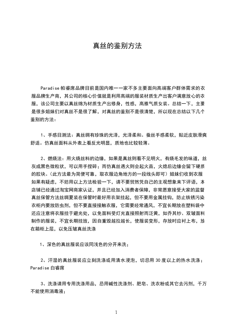 Paradise帕睿席品牌目前是国内唯一一家不多主要面向高端客户群体需求的衣服品牌生产商,其公司的核心价值就是利用高端的服装材质生产出客户满意放心的衣服,该公司主要以真丝绵为材质生产出修身,性感,高雅气质女装。总结一下,主要是很多姐妹们对真丝不是很了解,对真丝的鉴别不是很清楚,所以现在总结以下几个鉴别的方法: