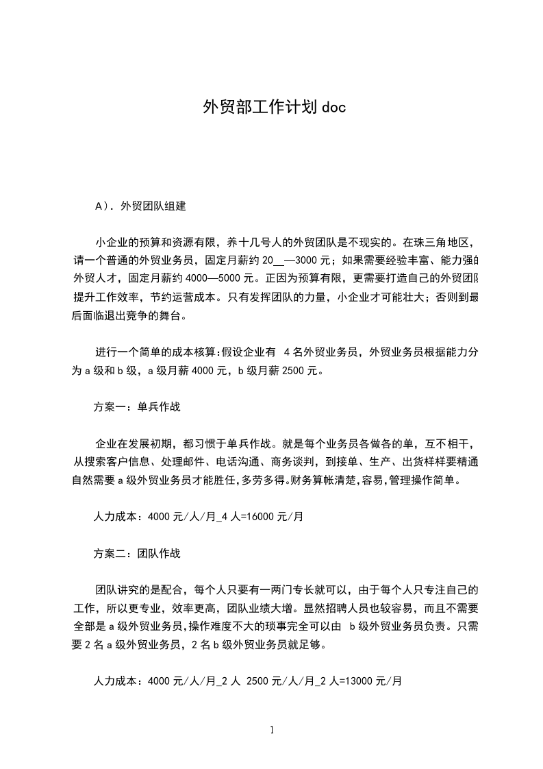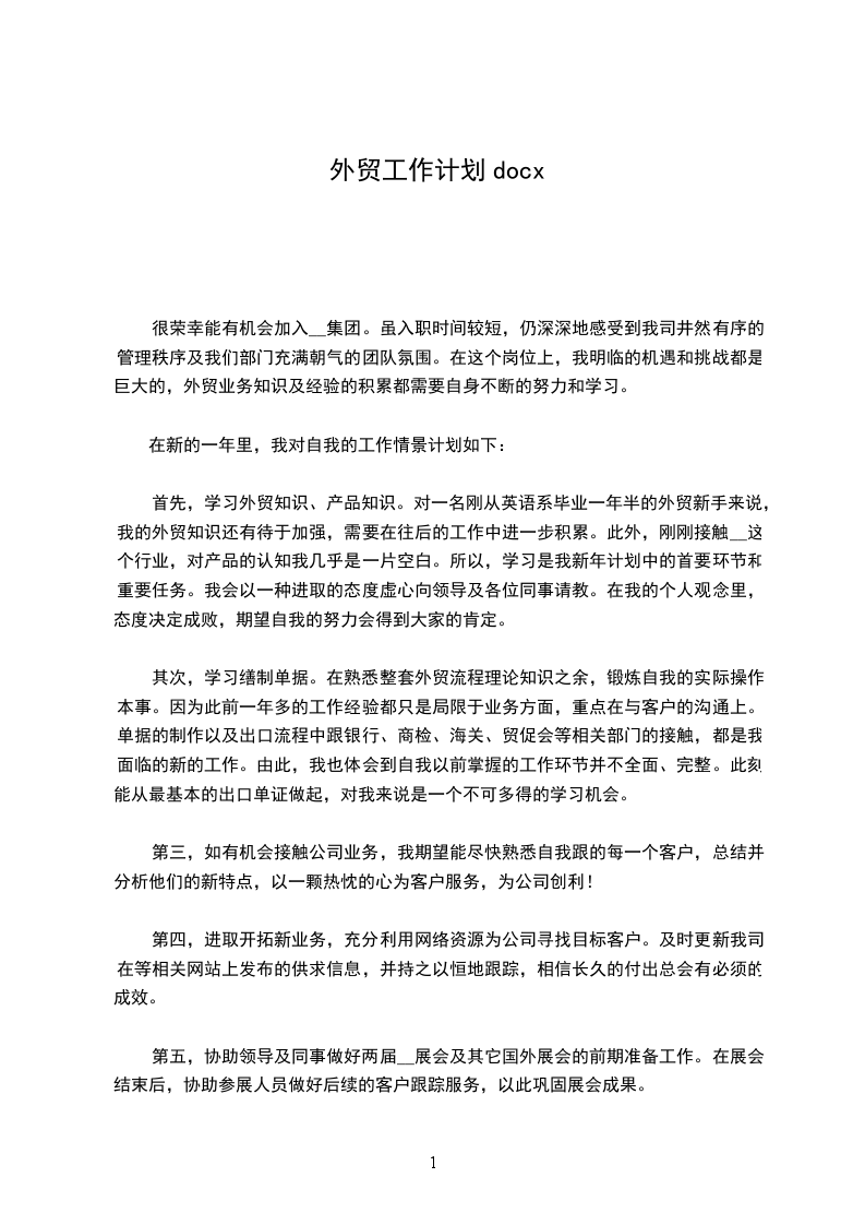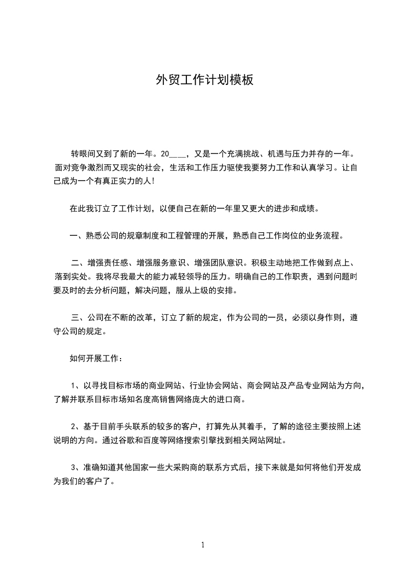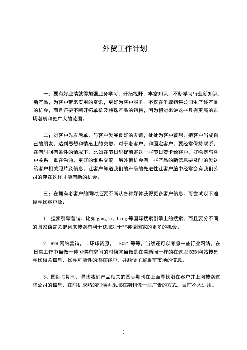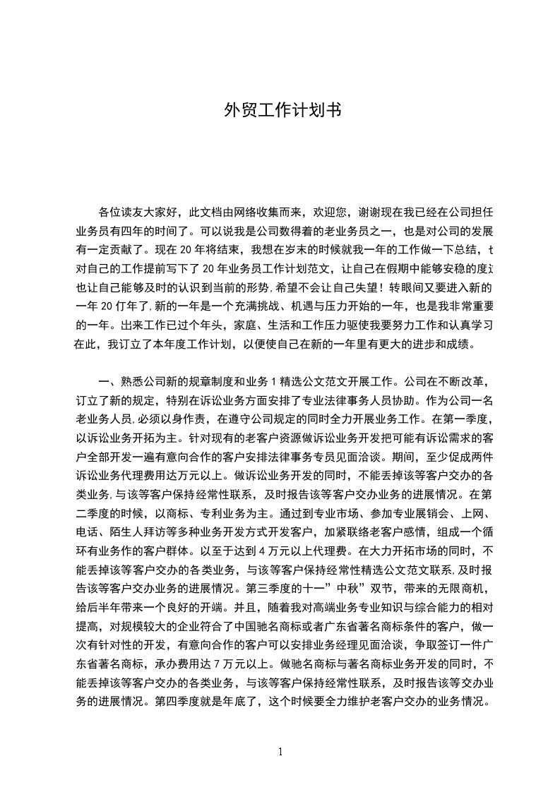 三、增强责任感、增强服务意识、增强团队意识。积极主动地把工作做到点上、落到实处。我将尽我最大的能力减轻领导的压力。以上,是我对20年的个人工作计划,可能还很不成熟,希望领导指正。火车跑的快还靠车头带,我希望得到公司领导、部门领导的正确引导和帮助。展望20年,我会更加努力、认真负责的去对待每一个业务,也力争赢的机会去寻求的客户,争取的单,完善业务开展工作。相信自己会完成新的任务,能迎接20年新的挑战。20年,我有着的期待,相信自己一精选公文范文定能够在20年取得更大的进步,自己就是这样一年一年的走过来的,从一个什么都不懂的毛头小伙到现在很有深度的资深公司业务员,我的成长充满了曲折不过在今后的工作中,我还是需要继续不断的努力,相信自己在20年一定走的更远!很荣幸能有机会加入集团。虽入职时间较短,仍深深地感受到我司井然有序的管理秩序及我们部门充满朝气的团队氛围。在这个岗位上,我明临的机遇和挑战都是巨大的,外贸业务知识及经验的积累都需要自身不断的努力和学习。在新的一年里,我对自己的工作情况计划如下:首先,学习外贸知识、产品知识。对一名刚从英语系毕业一年半的外贸新手来说,我的外贸知识还有待于加强,需要在往后的工作中进一步积累。此外,刚刚接触这个行业,对产品的认知我几乎是一片空白。因此,学习是我新年计划中的首要环节和重要任务。我会以一种积精选公文范文极的态度虚心向领导及各位同事请教。在我的个人观念里,态度决定成败,希望自己的努力会得到大家的肯定。其次,学习缮制单据。在熟悉整套外贸流程理论知识之余,锻炼自己的实际操作能力。因为此前一年多的工作经验都只是局限于业务方面,重点在与客户的沟通上。单据的制作以及出口流程中跟银行、商检、海关、贸促会等相关部门的接触,都是我面临的新的工作。由此,我也体会到自己以前掌握的工作环节并不全面、完整。现在能从最基本的出口单证做起,对我来说是一个不可多得的学习机会。第三,如有机会接触公司业务,我希望能尽快熟悉自己跟的每一个客户,总结并分析他们的新特点,以一颗热忱的心为客户服务,为公司创利!第四,积极开拓新业务,充分利用网络资源为公司寻找目标客户。及时更新我司在阿里巴巴等相关网站上发布的供求信息,并持之以恒地跟踪,相信长久的精选公文范文付出总会有一定的成效。第五,协助领导及同事做好两届展会及其它国外展会的前期准备工作。在展会结束后,协助参展人员做好后续的客户跟踪服务,以此巩固展会成果。另有几条小小的建议: