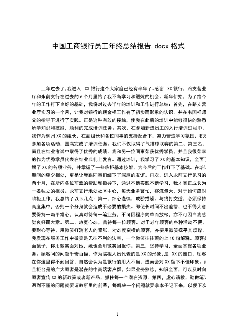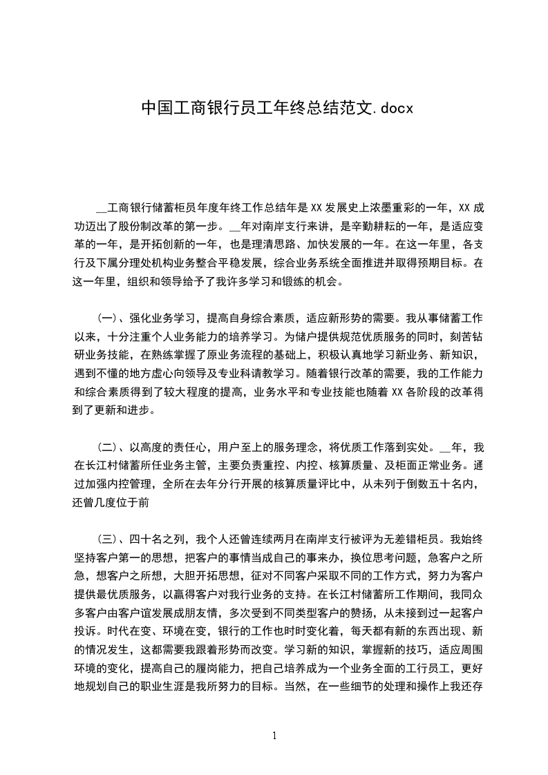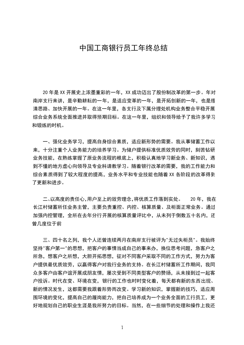 三、四十名之列,我个人还曾连续两月在南岸支行被评为"无过失柜员"。我始终坚持"客户第一"的思想,把客户的事情当成自己的事来办,换位思考问题,急客户之所急,想客户之所想,大胆开拓思想,征对不同客户采取不同的工作方式,努力为客户提供最优质效劳,以赢得客户对我行业务的支持。在长江村储蓄所工作期间,我同众多客户由客户谊开展成朋友情,屡次受到不同类型客户的赞扬,从未接到过一起客户投诉。时代在变、环境在变,银行的工作也时时变化着,每天都有新的东西出现、新的情况发生,这都需要我跟着形势而改变。学习新的知识,掌握新的技巧,适应周围环境的变化,提高自己的履岗能力,把自己培养成为一个业务全面的工行员工,更好地规划自己的职业生涯是我所努力的目标。当然,在一些细节的处理和操作上我还存在一定的欠缺,今后我将一如既往地做好本职工作,时刻以"效劳无止境,效劳要创新,效劳要持久"的效劳理念鞭策和完善自我,在领导和同事们的关心、指导和帮助中提高自己、更加严格要求自己,为XX的改革开展进程添砖加瓦,将优质效劳工作落到实处!