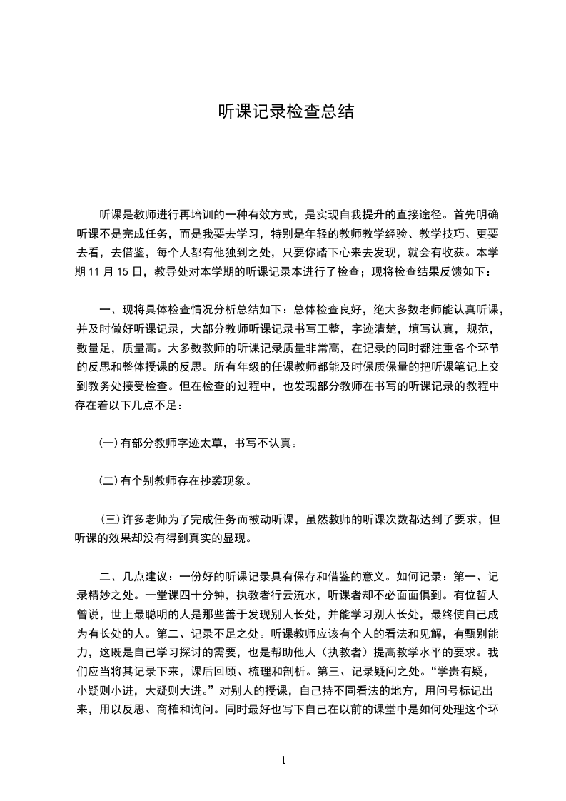 一、现将具体检查情况分析总结如下:总体检查良好,绝大多数老师能认真听课,并及时做好听课记录,大部分教师听课记录书写工整,字迹清楚,填写认真,规范,数量足,质量高。大多数教师的听课记录质量非常高,在记录的同时都注重各个环节的反思和整体授课的反思。所有年级的任课教师都能及时保质保量的把听课笔记上交到教务处接受检查。但在检查的过程中,也发现部分教师在书写的听课记录的教程中存在着以下几点不足: