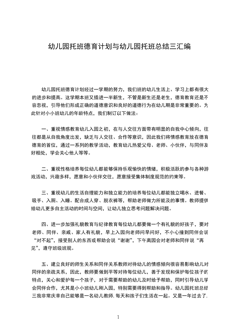 五、建立良好的师生关系和同伴关系教师对待幼儿的情感倾向很容易影响幼儿对同伴的亲疏关系,因此,教师要做到平等对待每位幼儿,善于发现和保护每位孩子的特点,关心和爱护每一个孩子,对于需要帮助的幼儿及时给予帮助,同时引导幼儿学会同伴合作,尤其是小小班幼儿刚入园,特别需要得到帮助和指导。幼儿园托班总结三我非常庆幸自己能够是一名幼儿教师,每天和孩子们生活在一起。又是一年过去了,在这一年中,有喜、有忧,幼儿园地生活总是那样令人回味无穷。今年九月我开始来到托班工作。我们班的孩子都是