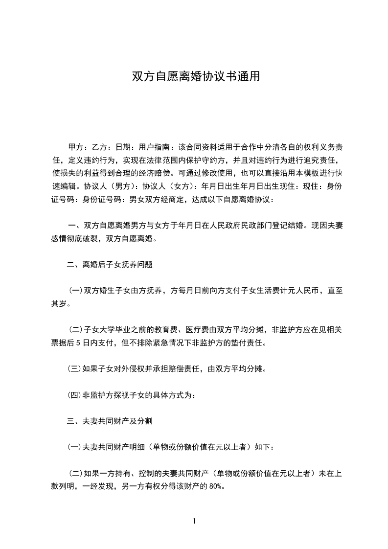 甲方:乙方:日期:用户指南:该合同资料适用于合作中分清各自的权利义务责任,定义违约行为,实现在法律范围内保护守约方,并且对违约行为进行追究责任,使损失的利益得到合理的经济赔偿。可通过修改使用,也可以直接沿用本模板进行快速编辑。协议人(男方):协议人(女方):年月日出生年月日出生现住:现住:身份证号码:身份证号码:男女双方经商定,达成以下自愿离婚协议: