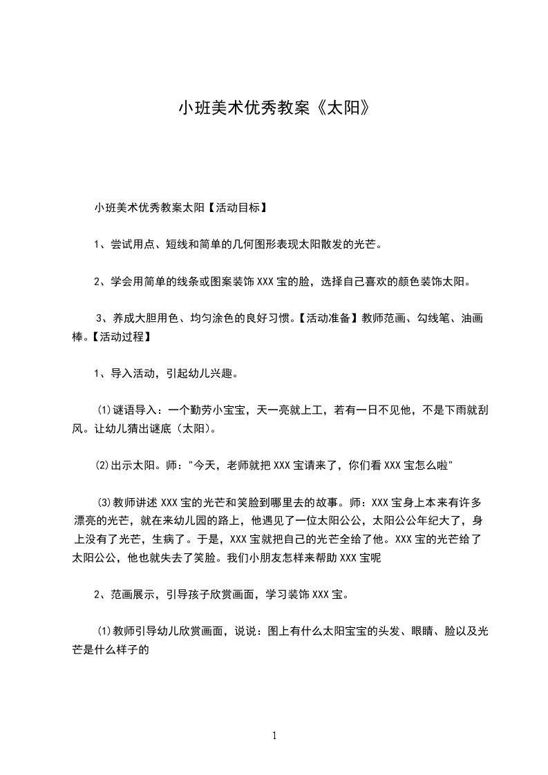 (3)教师讲述XXX宝的光芒和笑脸到哪里去的故事。师:XXX宝身上本来有许多漂亮的光芒,就在来幼儿园的路上,他遇见了一位太阳公公,太阳公公年纪大了,身上没有了光芒,生病了。于是,XXX宝就把自己的光芒全给了他。XXX宝的光芒给了太阳公公,他也就失去了笑脸。我们小朋友怎样来帮助XXX宝呢