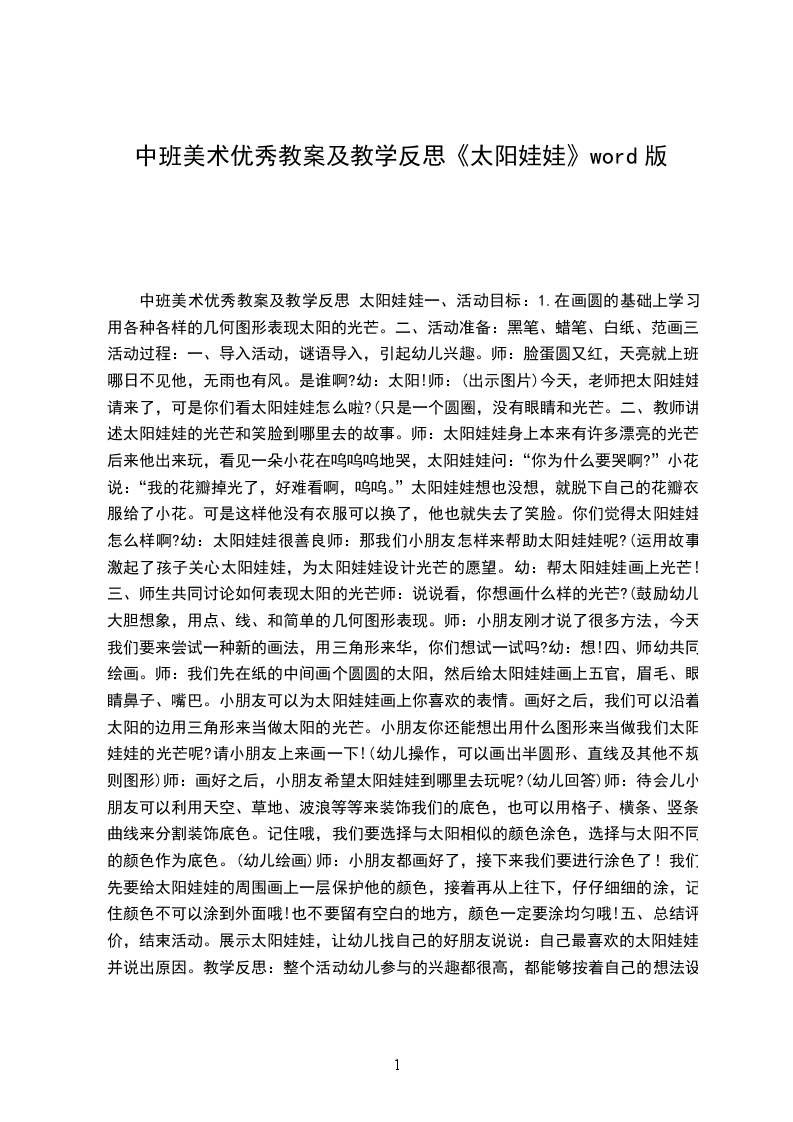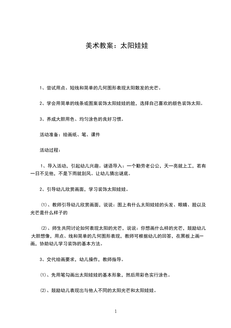 (1)教师引导幼儿欣赏画面,说说:图上有什么太阳宝宝的头发、眼睛、脸以及光芒是什么样子的