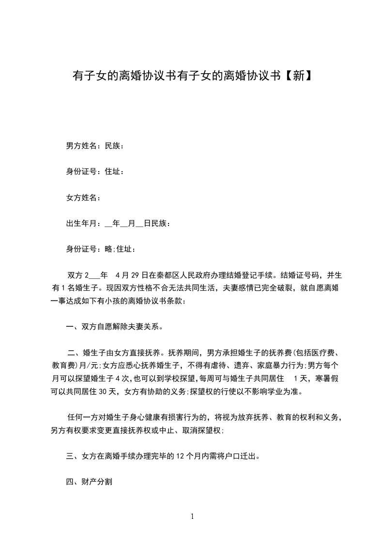 六、本离婚协议一式叁份,双方各执一份,婚姻登记机关存档一份,在双方签字,并经婚姻登记机关办理相应手续后生效。协议人:协议人:签订日期:年月日签订日期:年月日/