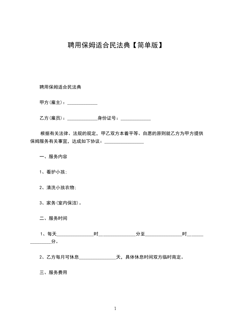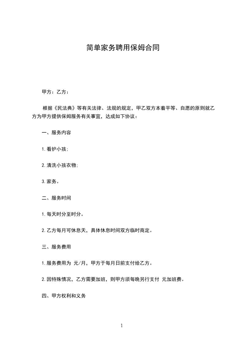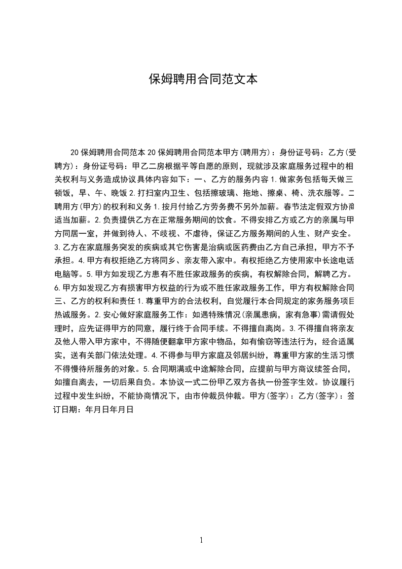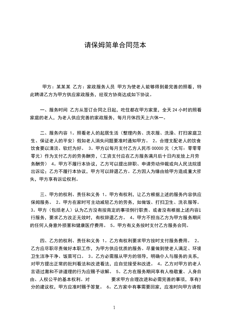 乙方从_____年_____月_____日到_____年_____月_____日起,自愿到甲方家工作,工作地址___________________,工作时间__________,是否吃住,休息日______,国定假日(可、不可)休息;国定假乙方工作,工资属单薪;工作内容______________工资___________及其他,乙方确认,签名_____________。甲方确认,签名_____________。丙方确认:签名。