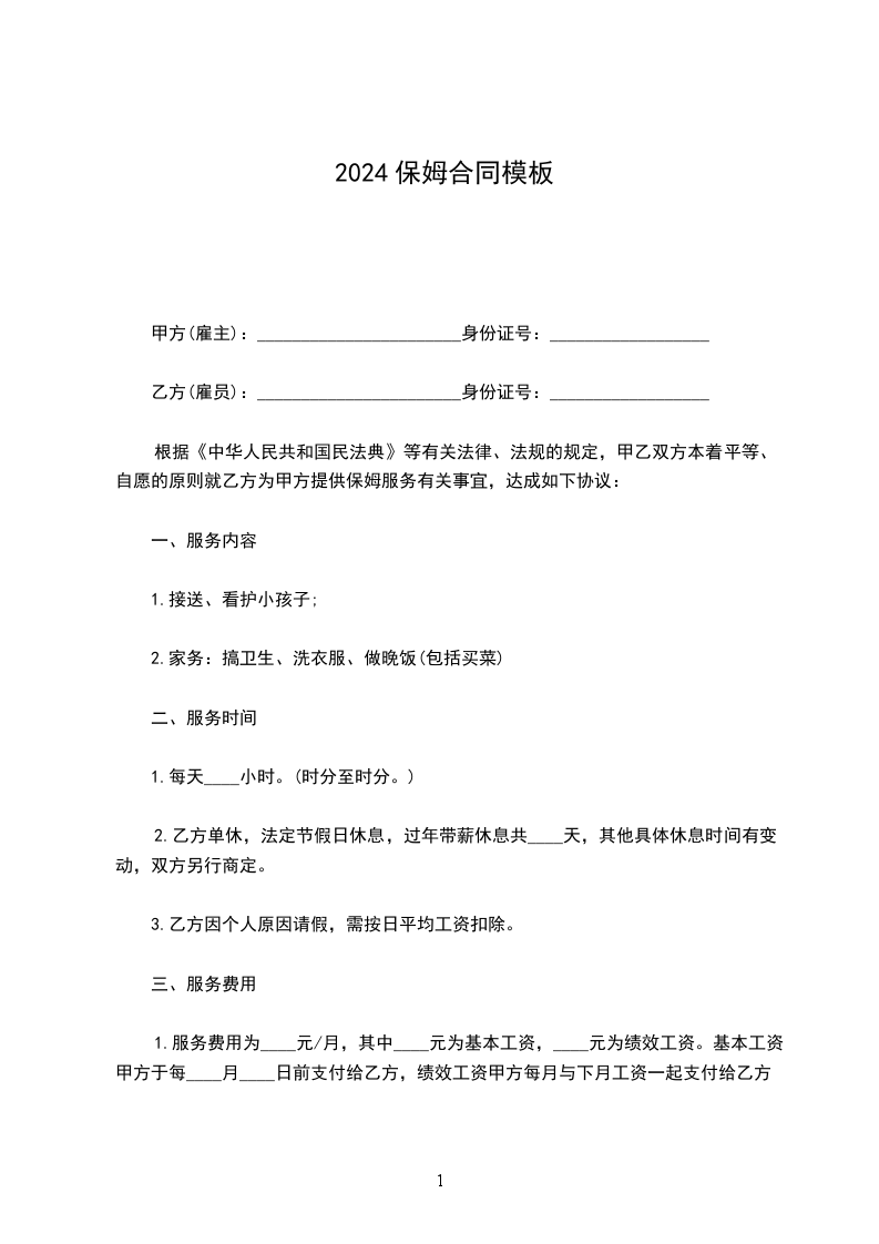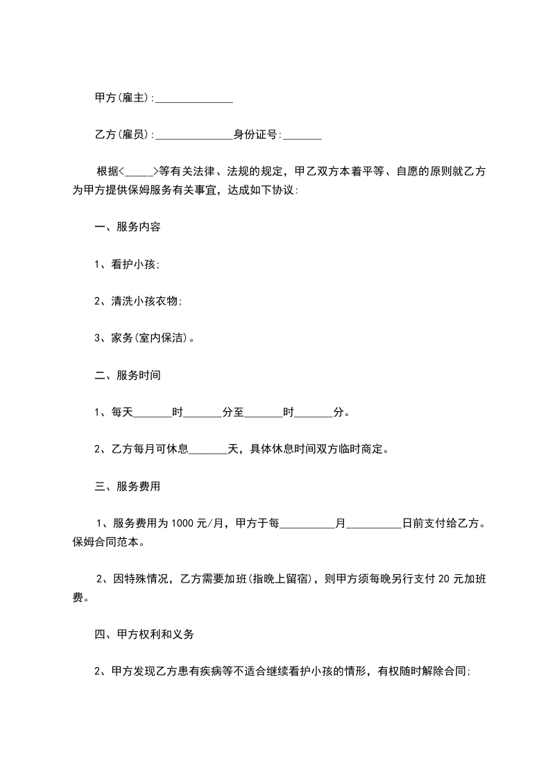 1、服务费用为1000元/月,甲方于每__________月__________日前支付给乙方。保姆合同范本。