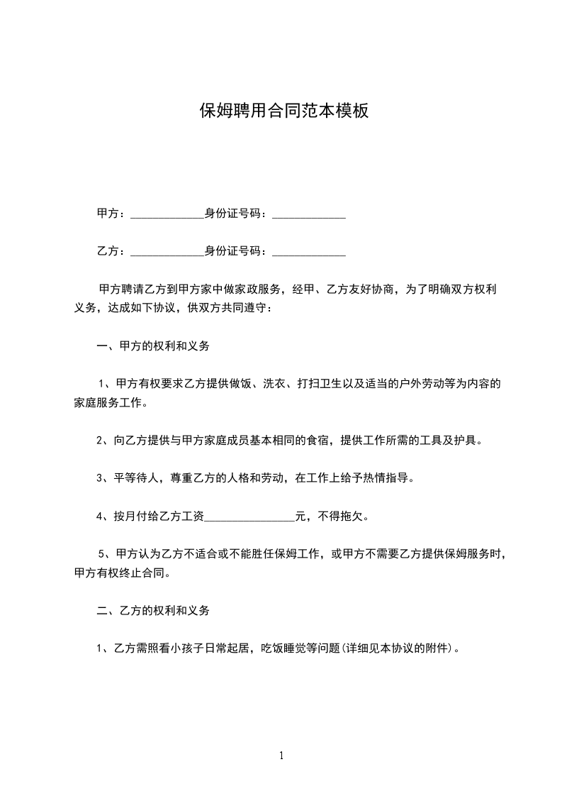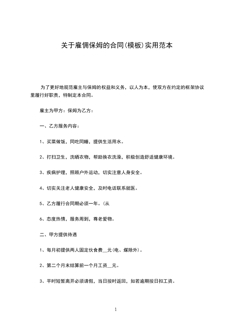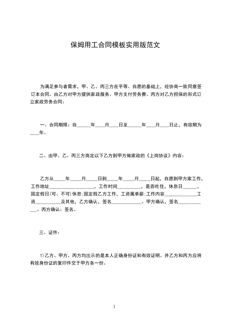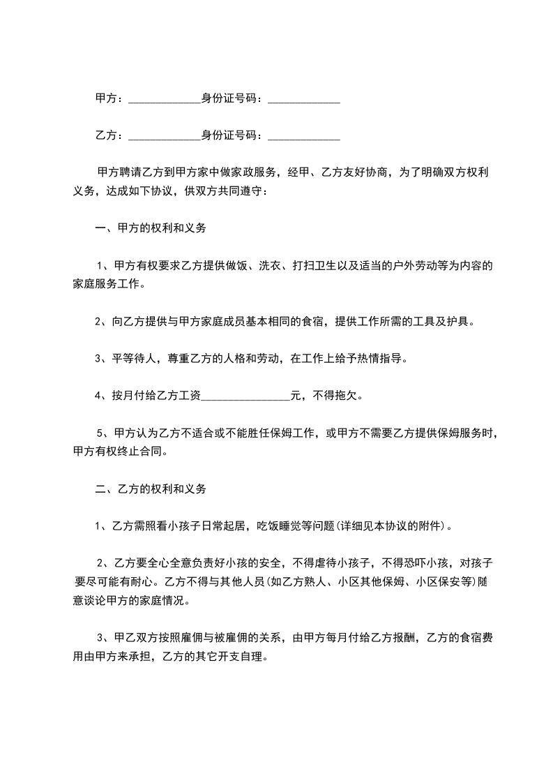 乙方从_____年_____月_____日到_____年_____月_____日起,自愿到甲方家工作,工作地址___________________,工作时间__________,是否吃住,休息日______,国定假日(可、不可)休息;国定假乙方工作,工资属单薪;工作内容______________工资___________及其他,乙方确认,签名_____________。甲方确认,签名_____________。丙方确认:签名。