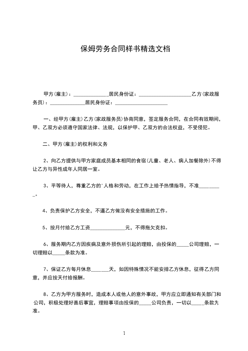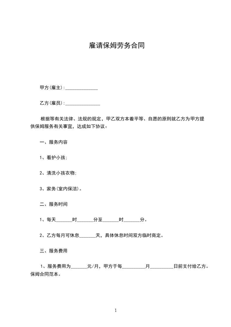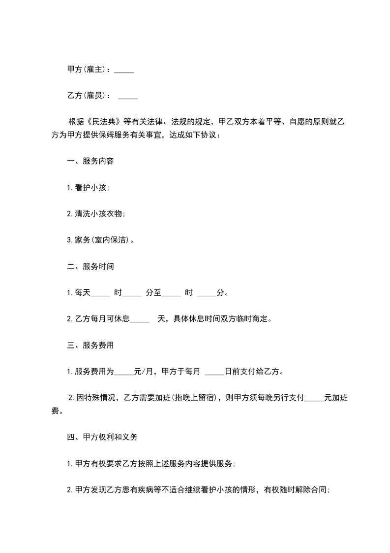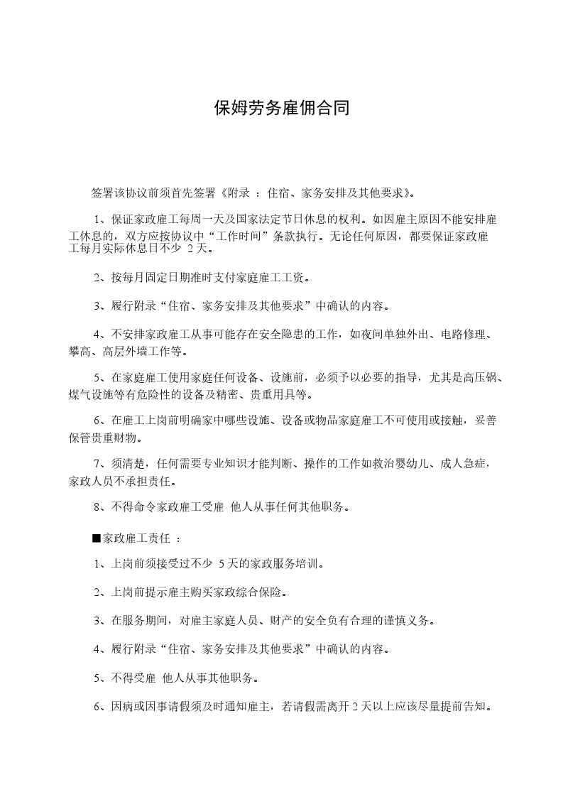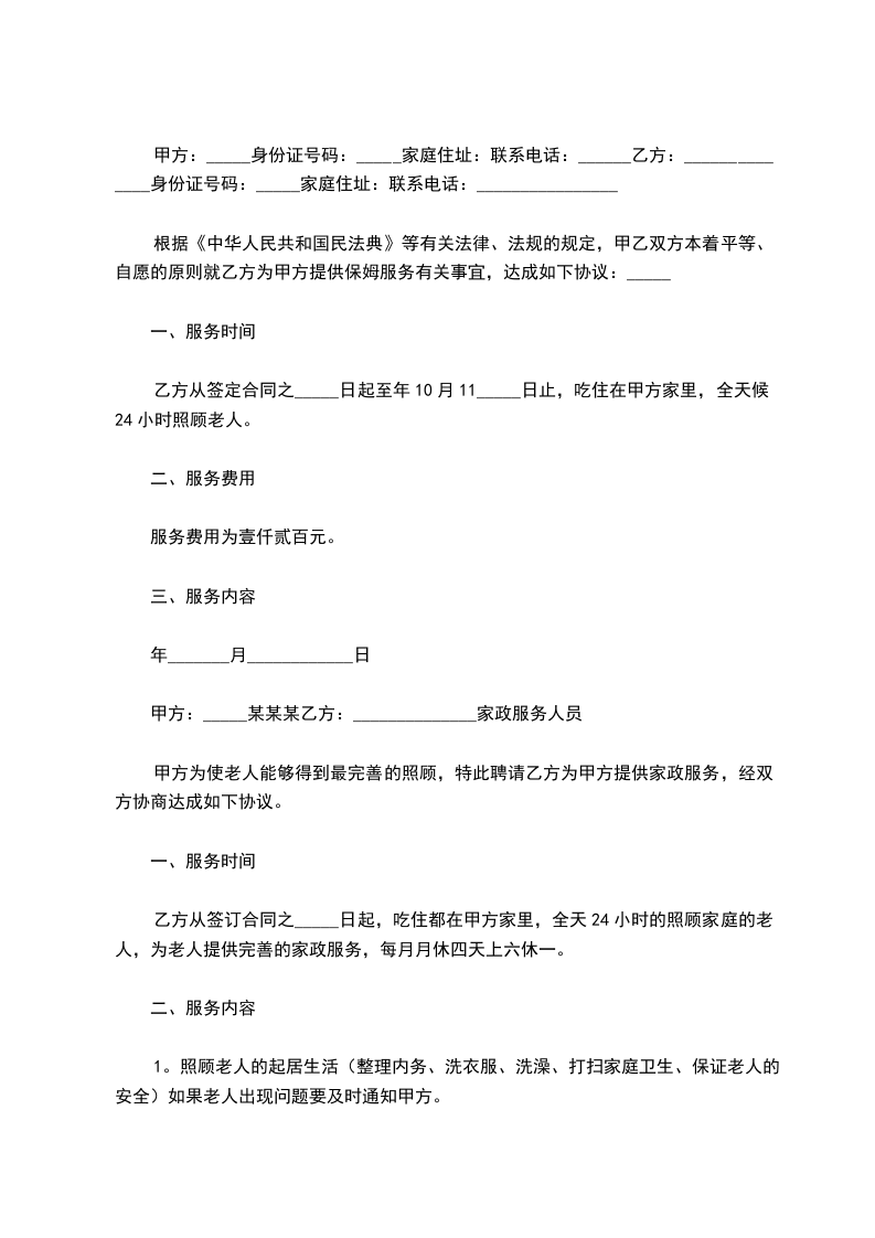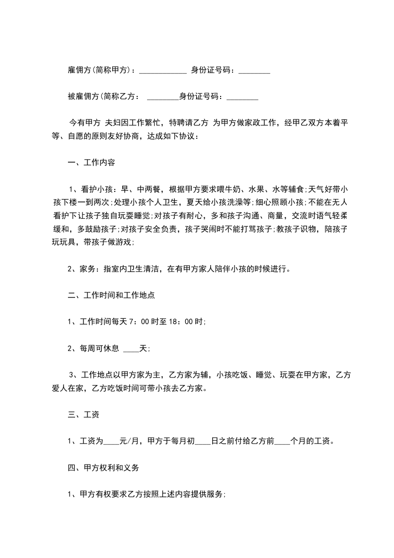 乙方从_____年_____月_____日到_____年_____月_____日起,自愿到甲方家工作,工作地址___________________,工作时间__________,是否吃住,休息日______,国定假日(可、不可)休息;国定假乙方工作,工资属单薪;工作内容______________工资___________及其他,乙方确认,签名_____________。甲方确认,签名_____________。丙方确认:签名。