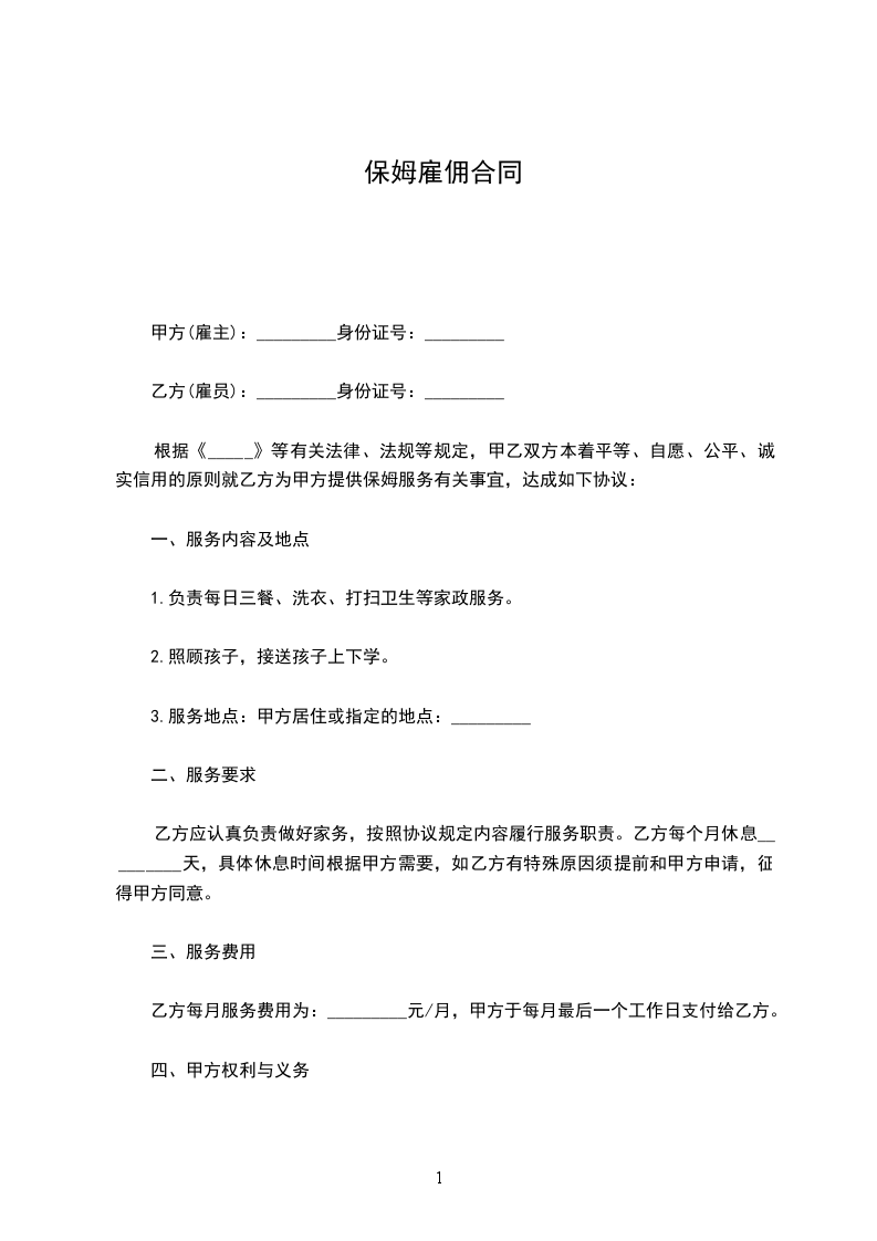 根据《_____》等有关法律、法规等规定,甲乙双方本着平等、自愿、公平、诚实信用的原则就乙方为甲方提供保姆服务有关事宜,达成如下协议: