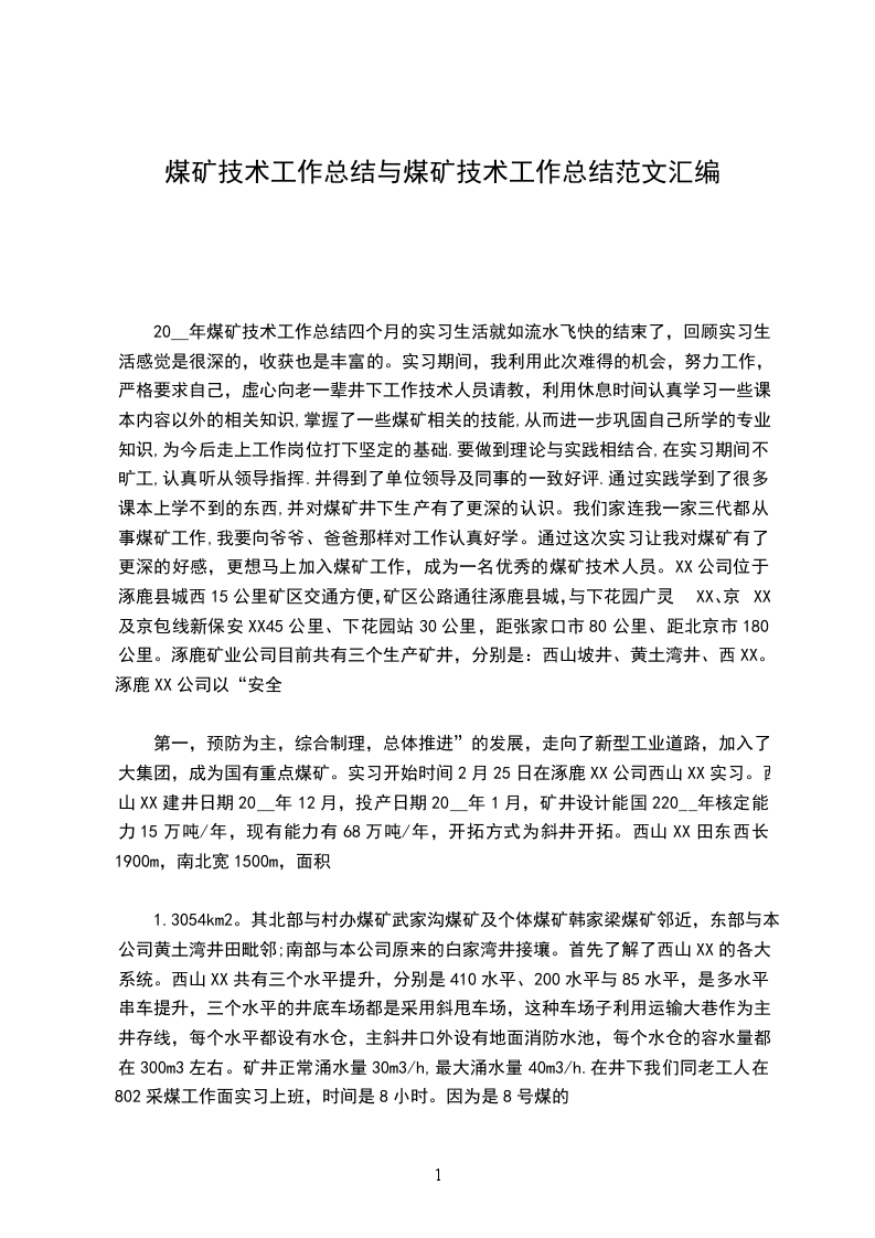 20__年煤矿技术工作总结四个月的实习生活就如流水飞快的结束了,回顾实习生活感觉是很深的,收获也是丰富的。实习期间,我利用此次难得的机会,努力工作,严格要求自己,虚心向老一辈井下工作技术人员请教,利用休息时间认真学习一些课本内容以外的相关知识,掌握了一些煤矿相关的技能,从而进一步巩固自己所学的专业知识,为今后走上工作岗位打下坚定的基础.要做到理论与实践相结合,在实习期间不旷工,认真听从领导指挥.并得到了单位领导及同事的一致好评.通过实践学到了很多课本上学不到的东西,并对煤矿井下生产有了更深的认识。我们家连我一家三代都从事煤矿工作,我要向爷爷、爸爸那样对工作认真好学。通过这次实习让我对煤矿有了更深的好感,更想马上加入煤矿工作,成为一名优秀的煤矿技术人员。XX公司位于涿鹿县城西15公里矿区交通方便,矿区公路通往涿鹿县城,与下花园广灵XX、京XX及京包线新保安XX45公里、下花园站30公里,距张家口市80公里、距北京市180公里。涿鹿矿业公司目前共有三个生产矿井,分别是:西山坡井、黄土湾井、西XX。涿鹿XX公司以“安全
