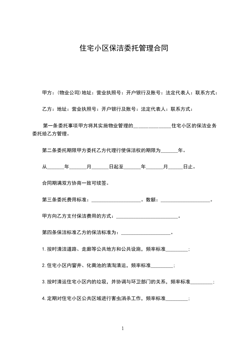 1、甲、乙双方如一方欲变更或中途终止合同,需提前壹个月前以书面形式通知另一方,另一方在15日内予以答复,任何一方不能按时答复,都要赔偿另一方壹月服务费作为违约金。如甲方不能履行合同半年以上,应对乙方投资购买的设备和保洁用品按半价收购。