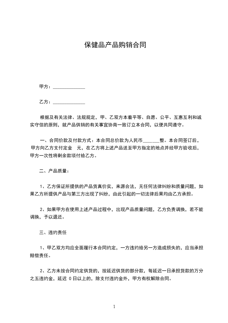 1、为保护市场规范运作,不窜货,乙方应向甲方交纳市场保证金,该保证金在乙方合同期满后30天内,由甲方折为产品返给乙方。