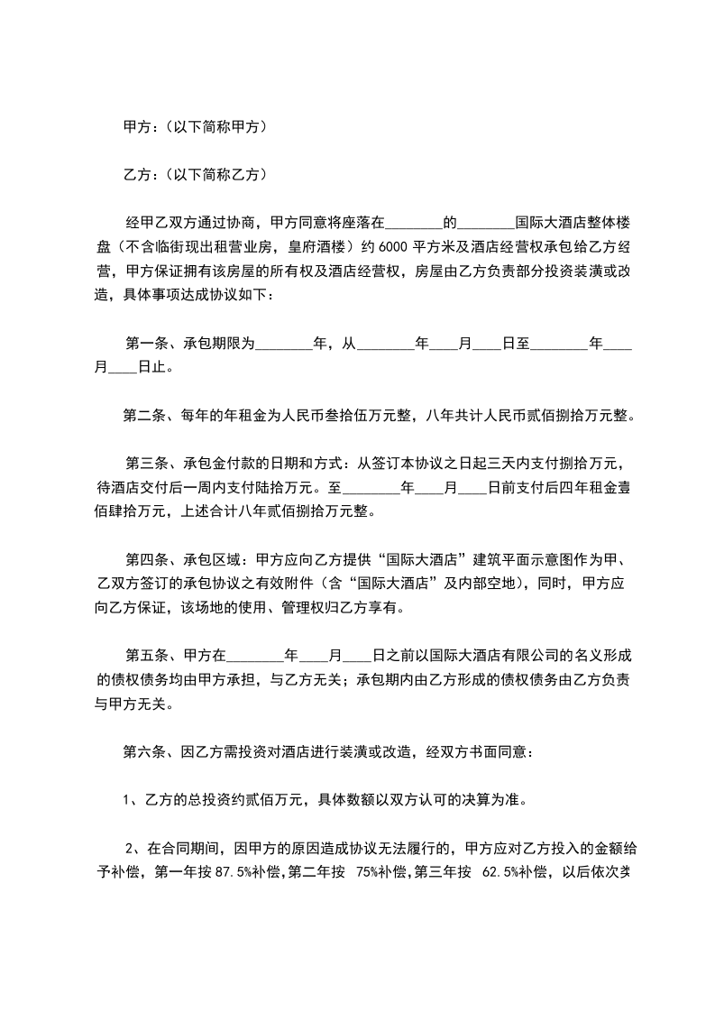 第六条、因乙方需投资对酒店进行装潢或改造,经双方书面同意: