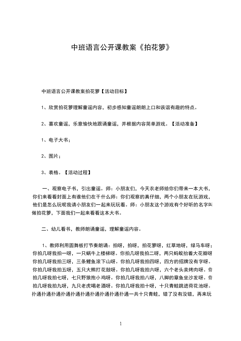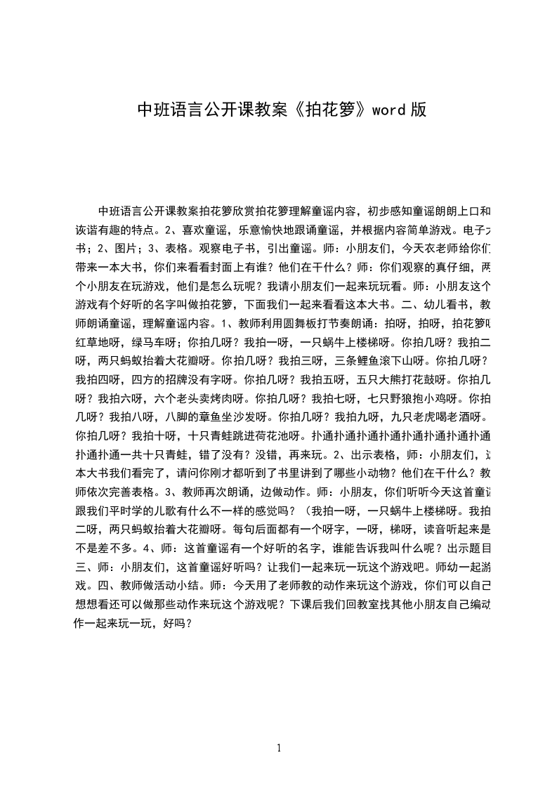 一、观察电子书,引出童谣。师:小朋友们,今天衣老师给你们带来一本大书,你们来看看封面上有谁他们在干什么师:你们观察的真仔细,两个小朋友在玩游戏,他们是怎么玩呢我请小朋友们一起来玩玩看。师:小朋友这个游戏有个好听的名字叫做拍花箩,下面我们一起来看看这本大书。