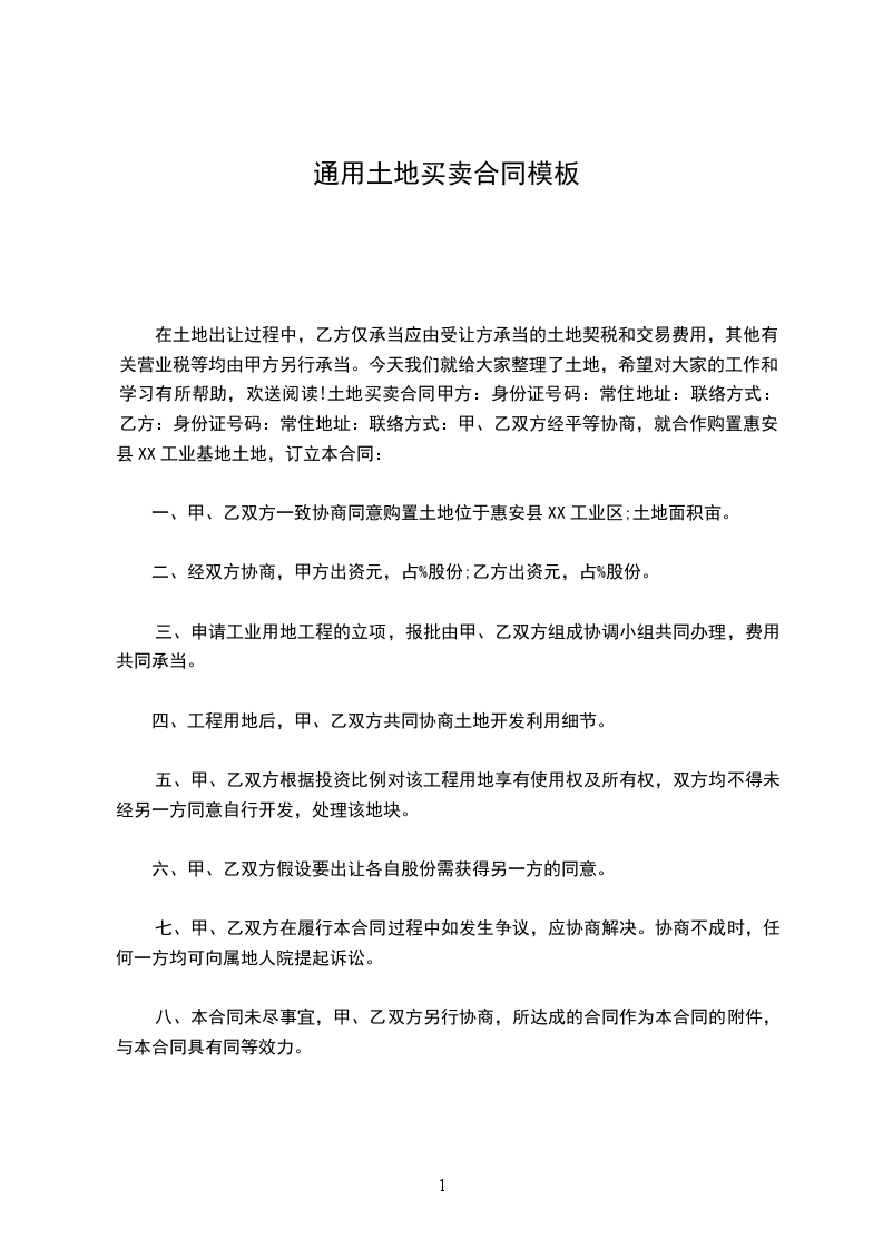 在土地出让过程中,乙方仅承当应由受让方承当的土地契税和交易费用,其他有关营业税等均由甲方另行承当。今天我们就给大家整理了土地,希望对大家的工作和学习有所帮助,欢送阅读!土地买卖合同甲方:身份证号码:常住地址:联络方式:乙方:身份证号码:常住地址:联络方式:甲、乙双方经平等协商,就合作购置惠安县XX工业基地土地,订立本合同: