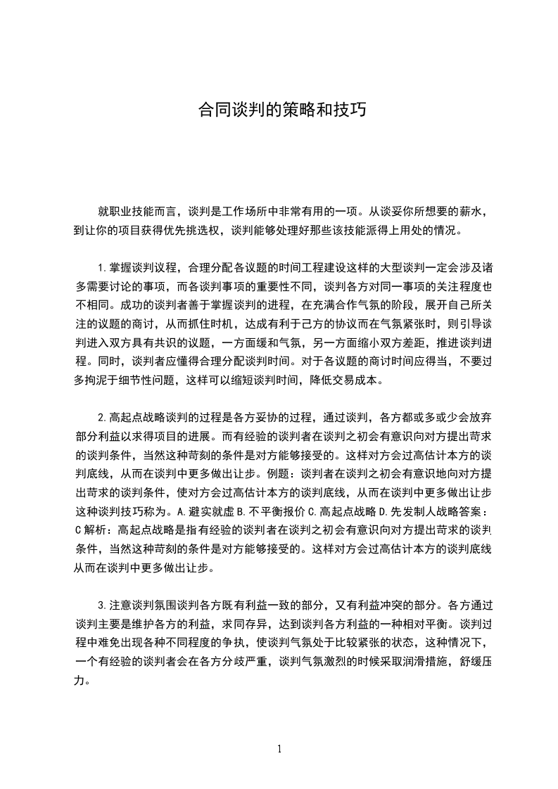 6.分配谈判角色,注意发挥专家的作用任何一方的谈判团都由众多人员组成,谈判中应利用各人不同的性格特征,各自扮演不同的角色。有积极进攻的角色,也有和颜悦色的角色。这样有软有硬,软硬兼施,可以事半功倍。本部分考试采分点:常见的几种谈判策略和技巧要点例题:常见的几种合同谈判策略和技巧有。A.掌握谈判议程,合理分配各议题的时间B.注意谈判氛围C.高起点战略D.避虚就实E.适当的拖延与休会答案:ABCE解析:常见的几种谈判策略和技巧有: