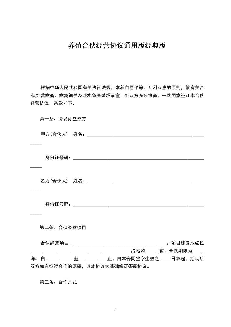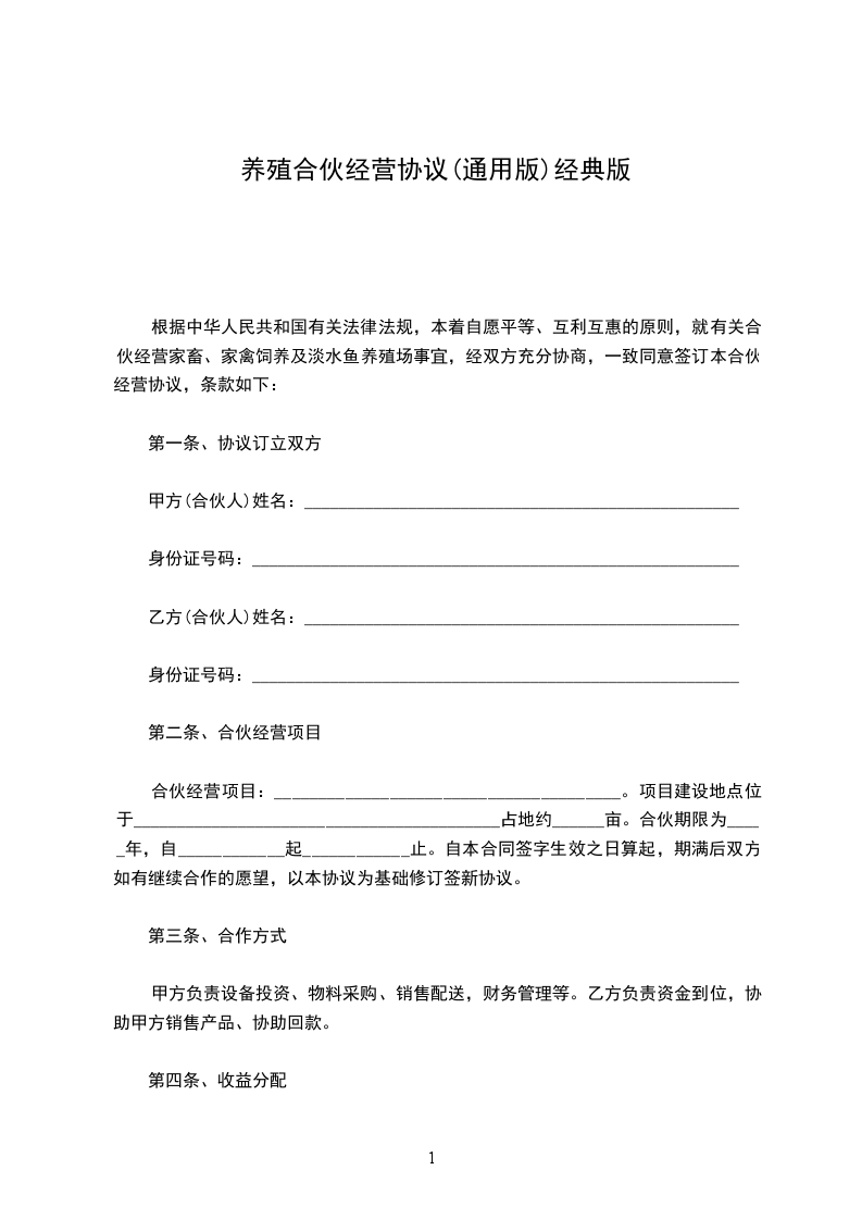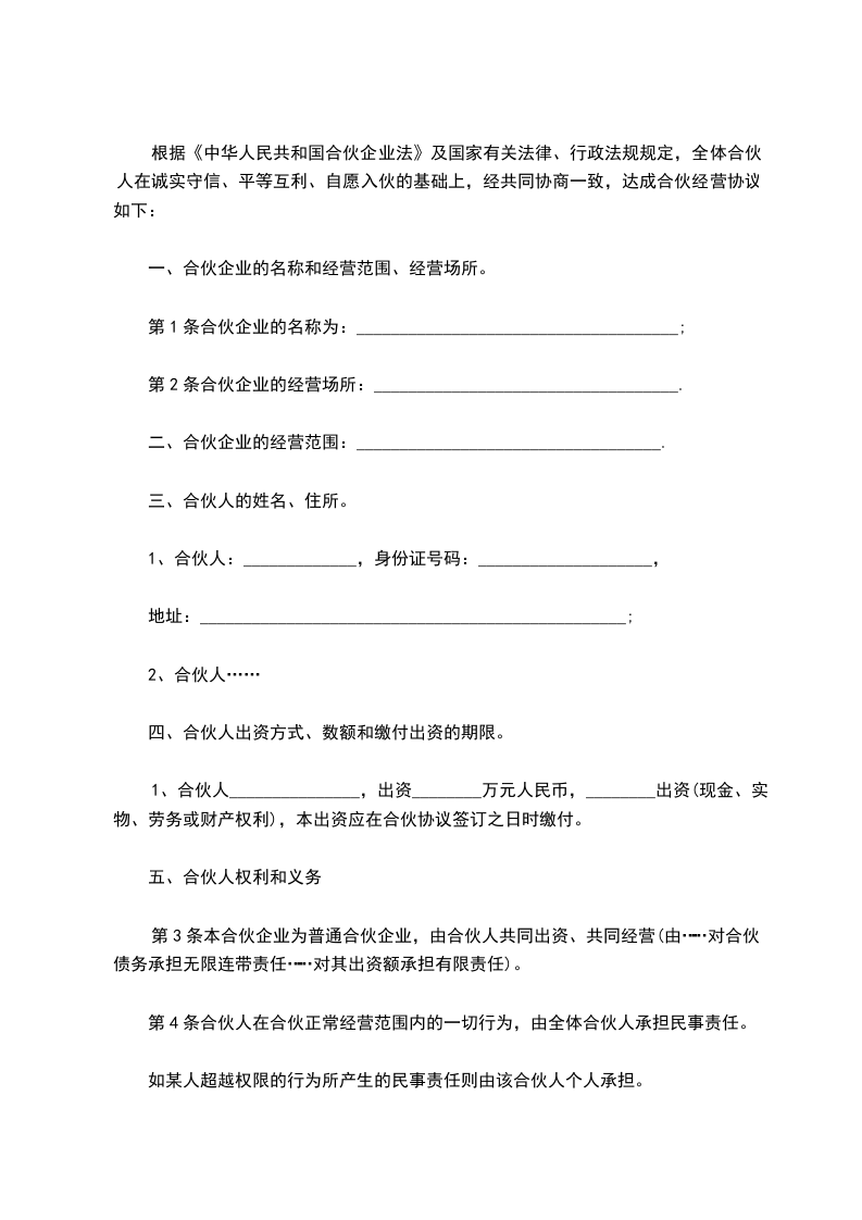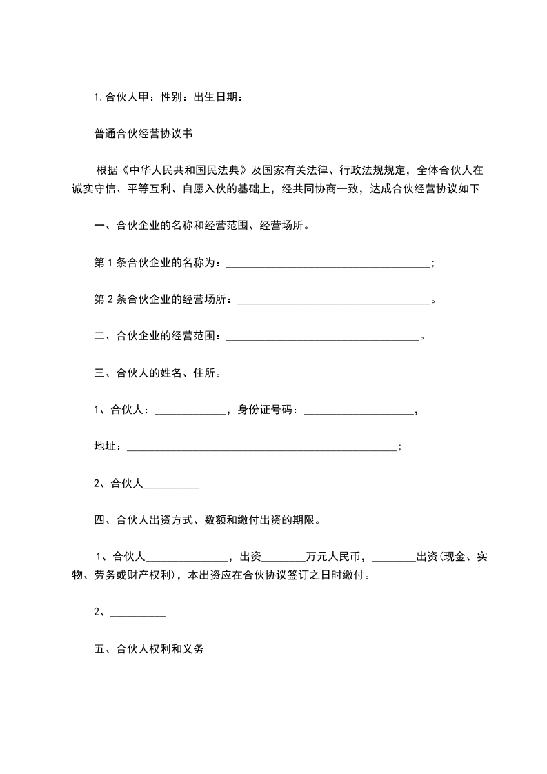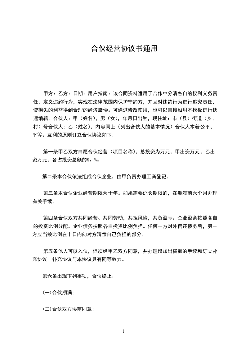 甲方:乙方:日期:用户指南:该合同资料适用于合作中分清各自的权利义务责任,定义违约行为,实现在法律范围内保护守约方,并且对违约行为进行追究责任,使损失的利益得到合理的经济赔偿。可通过修改使用,也可以直接沿用本模板进行快速编辑。合伙人:甲(姓名),男(女),年月日出生,现住址:市(县)街道(乡、村)号合伙人:乙(姓名),内容同上(列出合伙人的基本情况)合伙人本着公平、平等、互利的原则订立合伙协议如下: