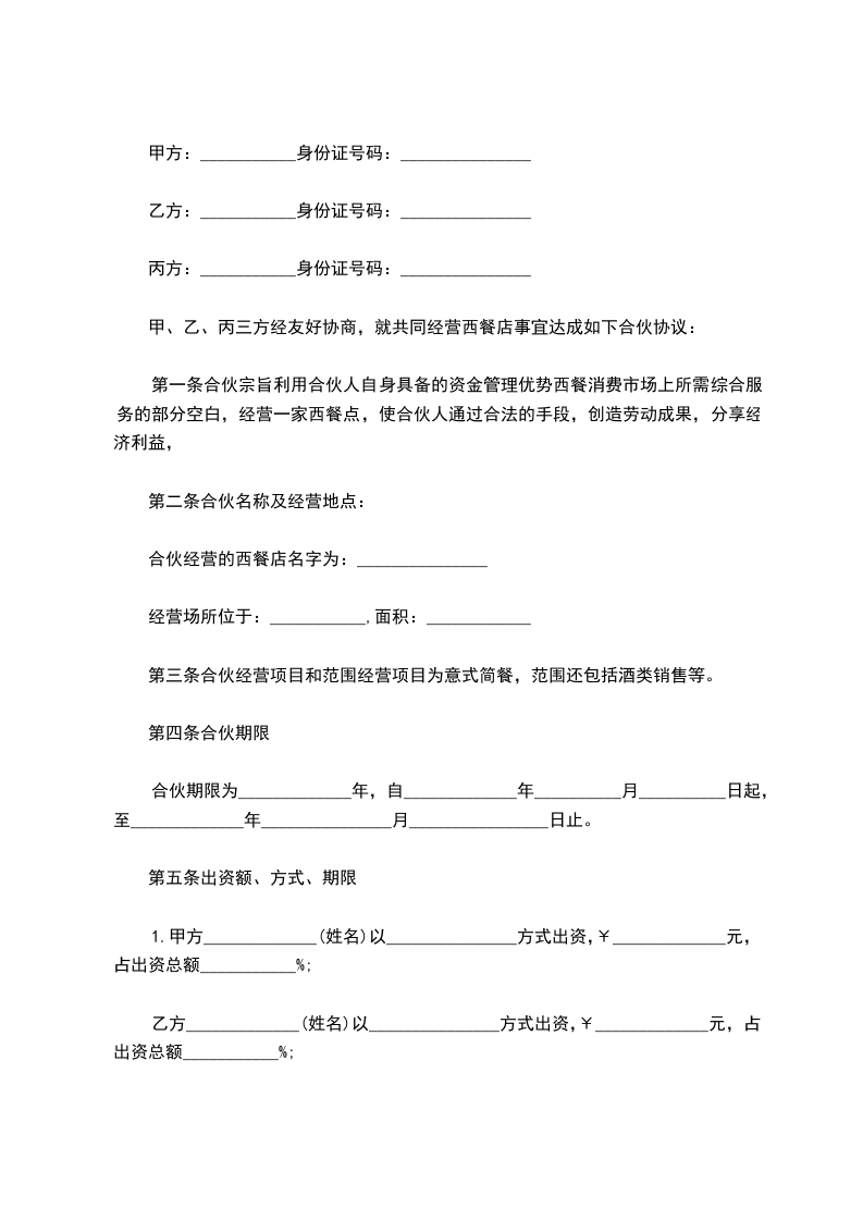 第八条本协议一式份,合伙人各一份。本协议自合伙人签字(或盖章)之日起生效。合伙人:(签字或盖章)合伙人:(签字或盖章)年月日