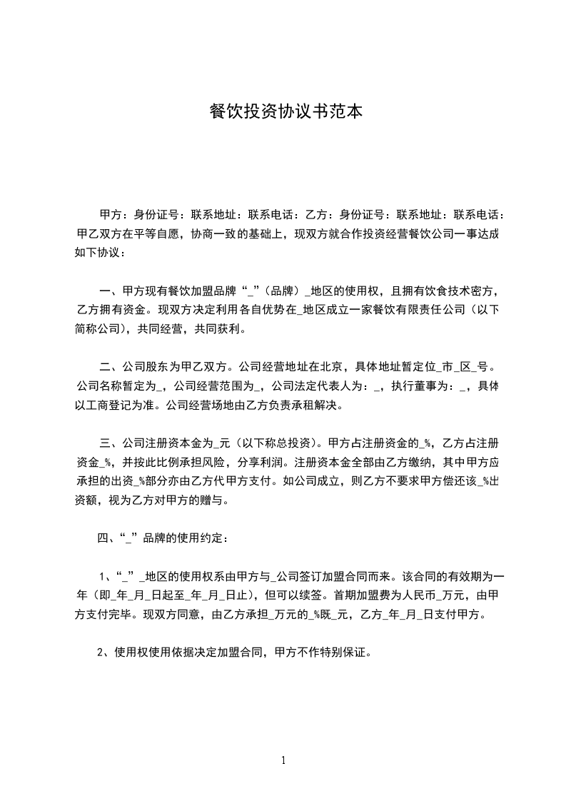 甲方:身份证号:联系地址:联系电话:乙方:身份证号:联系地址:联系电话:甲乙双方在平等自愿,协商一致的基础上,现双方就合作投资经营餐饮公司一事达成如下协议: