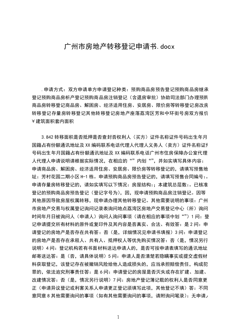 3.842转移面积是否抵押是否查封否权利人(买方)证件名称证件号码出生年月国籍占有份额通讯地址及XX编码联系电话代理人代理人义务人(卖方)证件名称证件号码出生年月国籍占有份额通讯地址及XX编码联系电话广州市住房保障办公室代理人代理人申请说明请根据实际情况,在相应的“”内划“”,并如实填写具体内容:申请商品房、解困房、经济适用住房、安居房、限价房等转移登记的,请填写预售地址:芳村花园二期小区H-1栋。申请预购商品房预告登记的,请填写预售合同编号:。申请存量房转移登记的,请如实填写以下情况:房屋结构:;本建筑总层数:。已核准登记的预购商品房预告登记(登记字号为),因,现申请预购商品房注销登记。因等其他原因导致房屋权属转移,现申请办理其他转移登记。其他需要说明的事项:广州市房地产交易与权属登记询问记录表询问地点荔湾区房地产交易登记中心(所)询问时间年月日被询问人(申请人)询问人询问事项(请在相应的事项中划“”)1问:登记申请提交所有材料的原件或复印件及其内容是否真实、合法、有效答:是2问:申请登记的房地产是否存在共有答:否(是,详细情况见申请书填报)3问:申请登记的房地产是否存在承租人、共有人、抵押权人等优先购买情况答:否(是,情况另行说明)4问:登记机构若有书面材料送达申请人的,是否可按申请表填写的通讯地址邮寄送达答:是(否,请具体说明)5问:申请人是否清楚若隐瞒事实或提交虚假材料获取登记,该登记存在被撤销风险给他人造成损失的,应当承担赔偿责任,构成犯罪的,依法追究刑事责任答:是6问:申请登记的房屋是否灭失或存在扩建、加建、改建情况答:否(是,情况另行说明)7问:房地产登记簿记载的权利人是否同意更正(申请异议登记或利害关系人申请更正登记须填写此项,其他登记不填)答:不同意同意8其他需要询问的事项(如有其他需要询问的事项,请附询问笔录):无申请人承诺本申请书及询问记录表填报内容真实,并且是申请人真实的意思表示。如有任何虚假,审批(或批准)机关可终止审理,由此引致的法律责任,概由申请人承担。权利人(买方)签名:义务人(卖方)签名:(单位盖章)(单位盖章)代理人签名:代理人签名:(单位盖章)(单位盖章)年月日年月日;