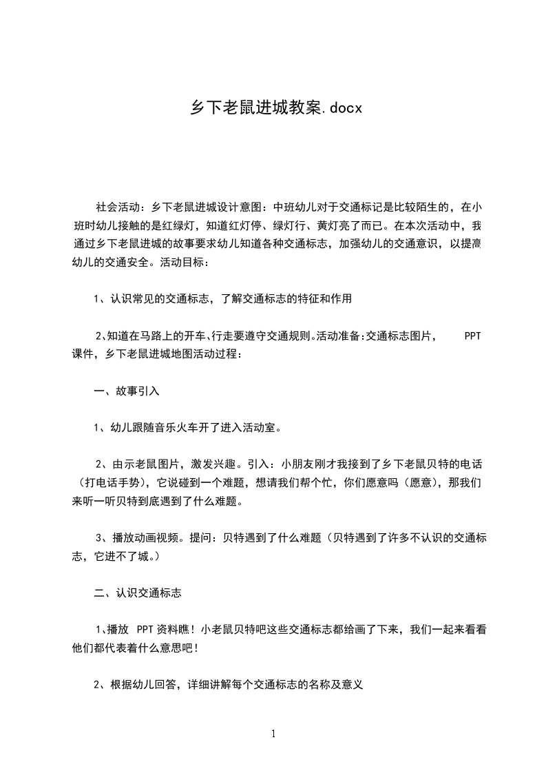 社会活动:乡下老鼠进城设计意图:中班幼儿对于交通标记是比较陌生的,在小班时幼儿接触的是红绿灯,知道红灯停、绿灯行、黄灯亮了而已。在本次活动中,我通过乡下老鼠进城的故事要求幼儿知道各种交通标志,加强幼儿的交通意识,以提高幼儿的交通安全。活动目标: