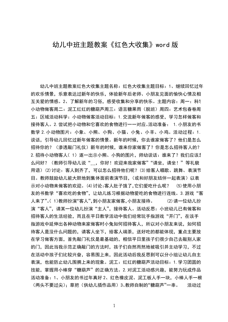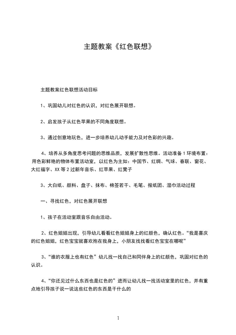 4、培养从多角度思考问题的思维品质,发展扩散性思维。活动准备1环境布置:用色彩鲜艳的物体布置活动室,以红色为主如:中国节、红绸、气球、春联、窗花、大红福字、XX等2过新年音乐、红苹果、红凳子