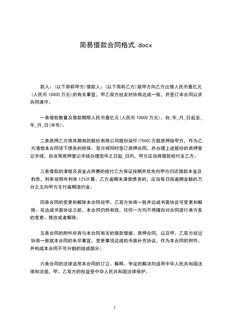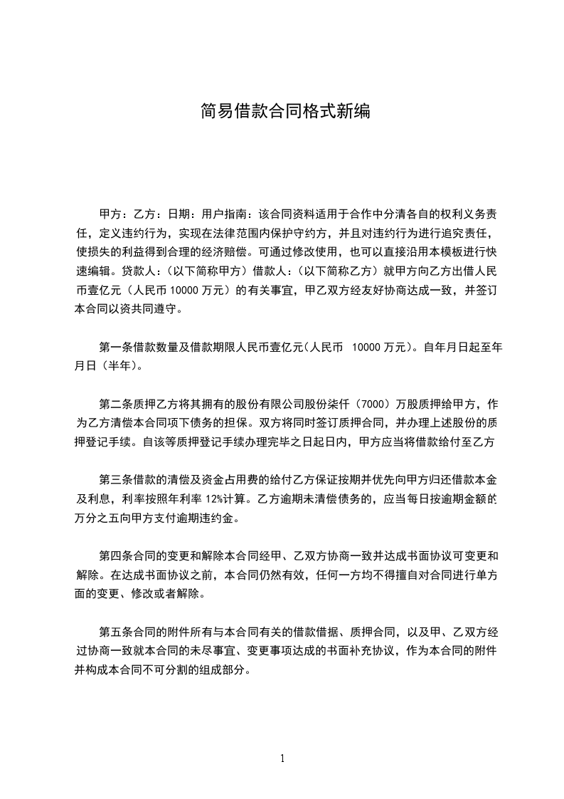 甲方:乙方:日期:用户指南:该合同资料适用于合作中分清各自的权利义务责任,定义违约行为,实现在法律范围内保护守约方,并且对违约行为进行追究责任,使损失的利益得到合理的经济赔偿。可通过修改使用,也可以直接沿用本模板进行快速编辑。贷款人:(以下简称甲方)借款人:(以下简称乙方)就甲方向乙方出借人民币壹亿元(人民币10000万元)的有关事宜,甲乙双方经友好协商达成一致,并签订本合同以资共同遵守。