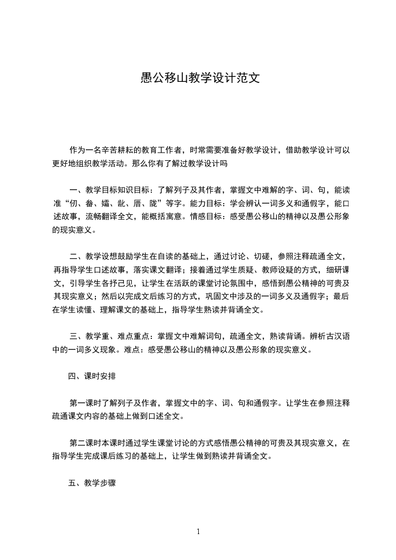 二、教学设想鼓励学生在自读的基础上,通过讨论、切磋,参照注释疏通全文,再指导学生口述故事,落实课文翻译;接着通过学生质疑、教师设疑的方式,细研课文,引导学生各抒己见,让学生在活跃的课堂讨论氛围中,感悟到愚公精神的可贵及其现实意义;然后以完成文后练习的方式,巩固文中涉及的一词多义及通假字;最后,在学生读懂、理解课文的基础上,指导学生熟读并背诵全文。