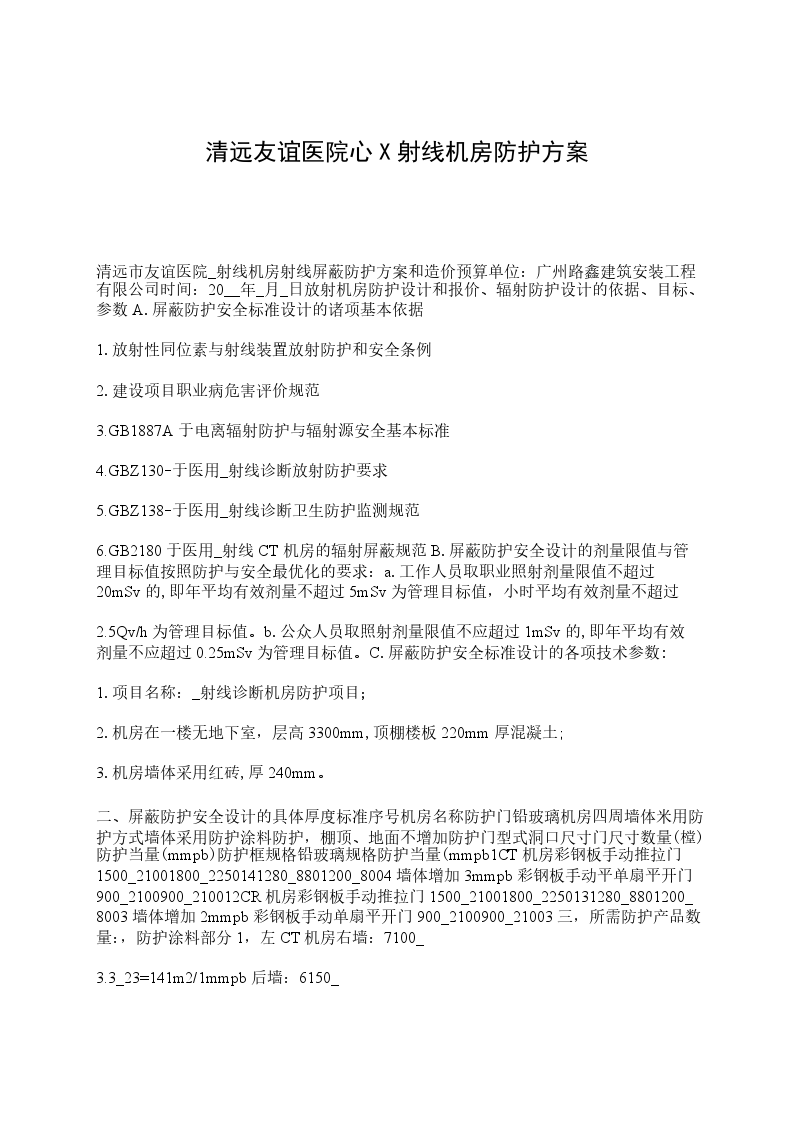 清远市友谊医院_射线机房射线屏蔽防护方案和造价预算单位:广州路鑫建筑安装工程有限公司时间:20__年_月_日放射机房防护设计和报价、辐射防护设计的依据、目标、参数A.屏蔽防护安全标准设计的诸项基本依据