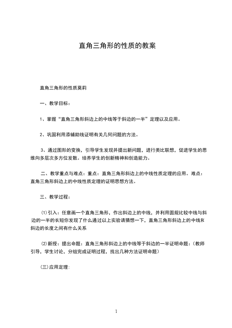 二、教学重点与难点:重点:直角三角形斜边上的中线性质定理的应用。难点:直角三角形斜边上的中线性质定理的证明思想方法。
