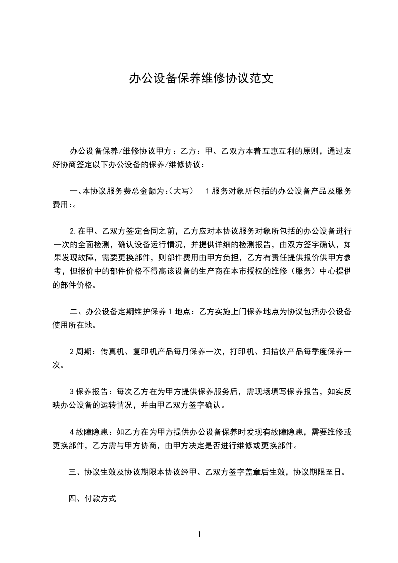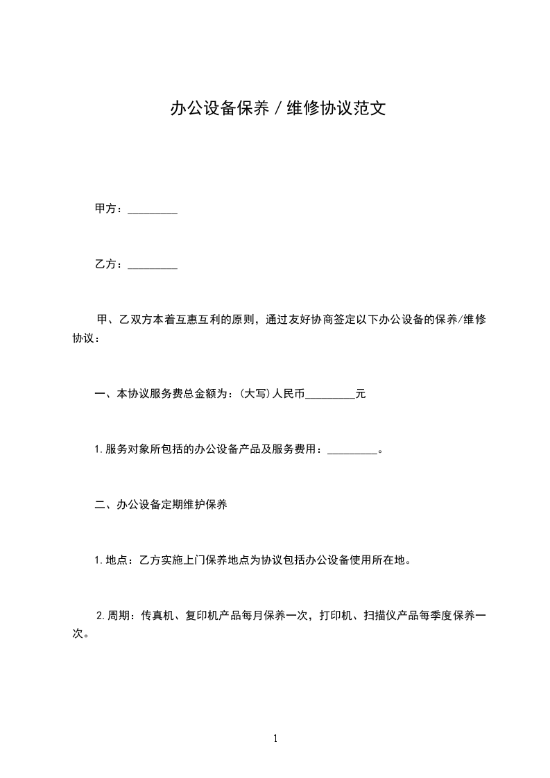 甲、乙双方本着互惠互利的原则,通过友好协商签定以下办公设备的保养/维修协议: