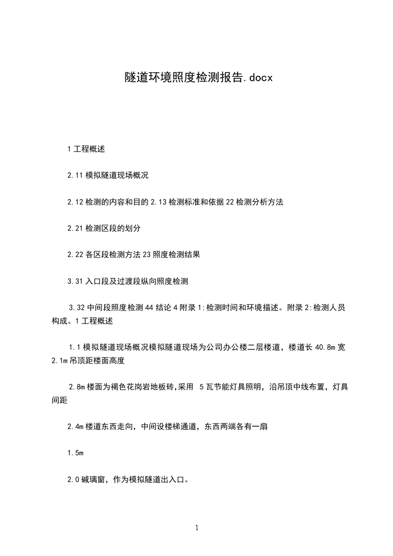 3.32中间段照度检测44结论4附录1:检测时间和环境描述。附录2:检测人员构成。1工程概述