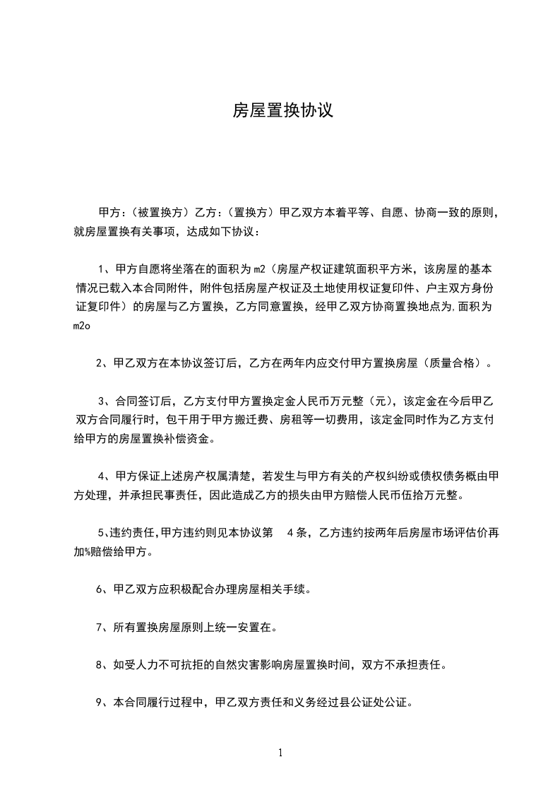 甲方:(被置换方)乙方:(置换方)甲乙双方本着平等、自愿、协商一致的原则,就房屋置换有关事项,达成如下协议: