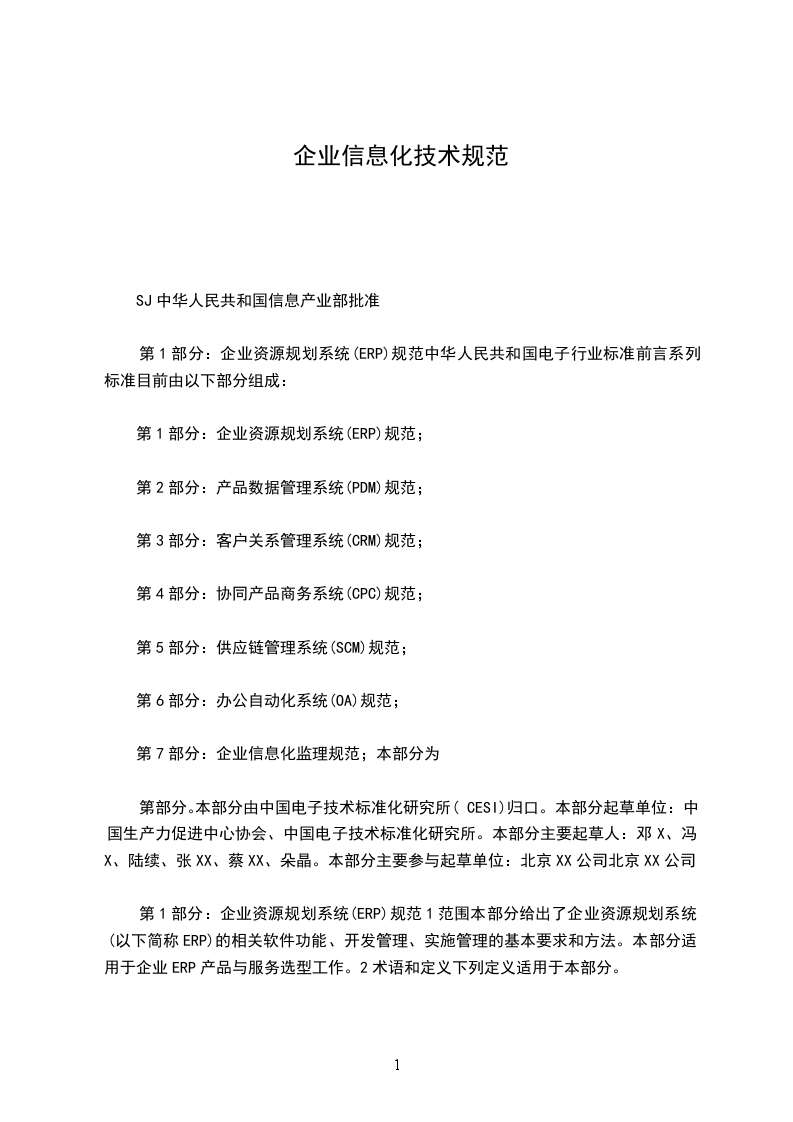 第1部分:企业资源规划系统(ERP)规范中华人民共和国电子行业标准前言系列标准目前由以下部分组成: