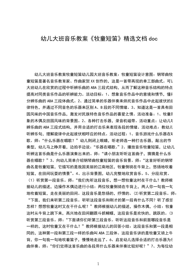 幼儿大班音乐教案牧童短笛音乐教案:牧童短笛设计意图:钢琴曲牧童短笛是著名音乐教育家、作曲家贺XX创作的,这是一首带再现的单三部曲式。可让大班幼儿在欣赏的过程中听辨乐曲的AA三段式结构,从而了解这种音乐结构的特点,提高对同类音乐作品的听辨能力。活动目标: