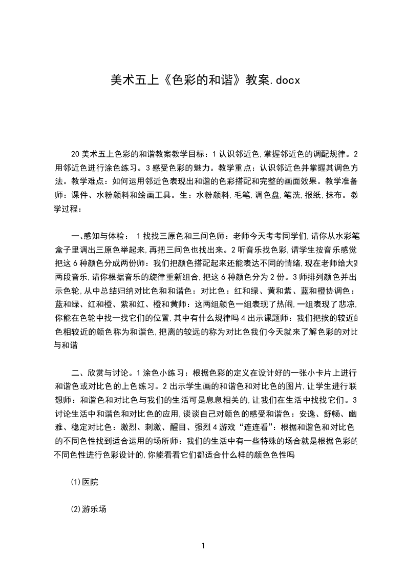 20美术五上色彩的和谐教案教学目标:1认识邻近色,掌握邻近色的调配规律。2用邻近色进行涂色练习。3感受色彩的魅力。教学重点:认识邻近色并掌握其调色方法。教学难点:如何运用邻近色表现出和谐的色彩搭配和完整的画面效果。教学准备:师:课件、水粉颜料和绘画工具。生:水粉颜料,毛笔,调色盘,笔洗,报纸,抹布。教学过程: