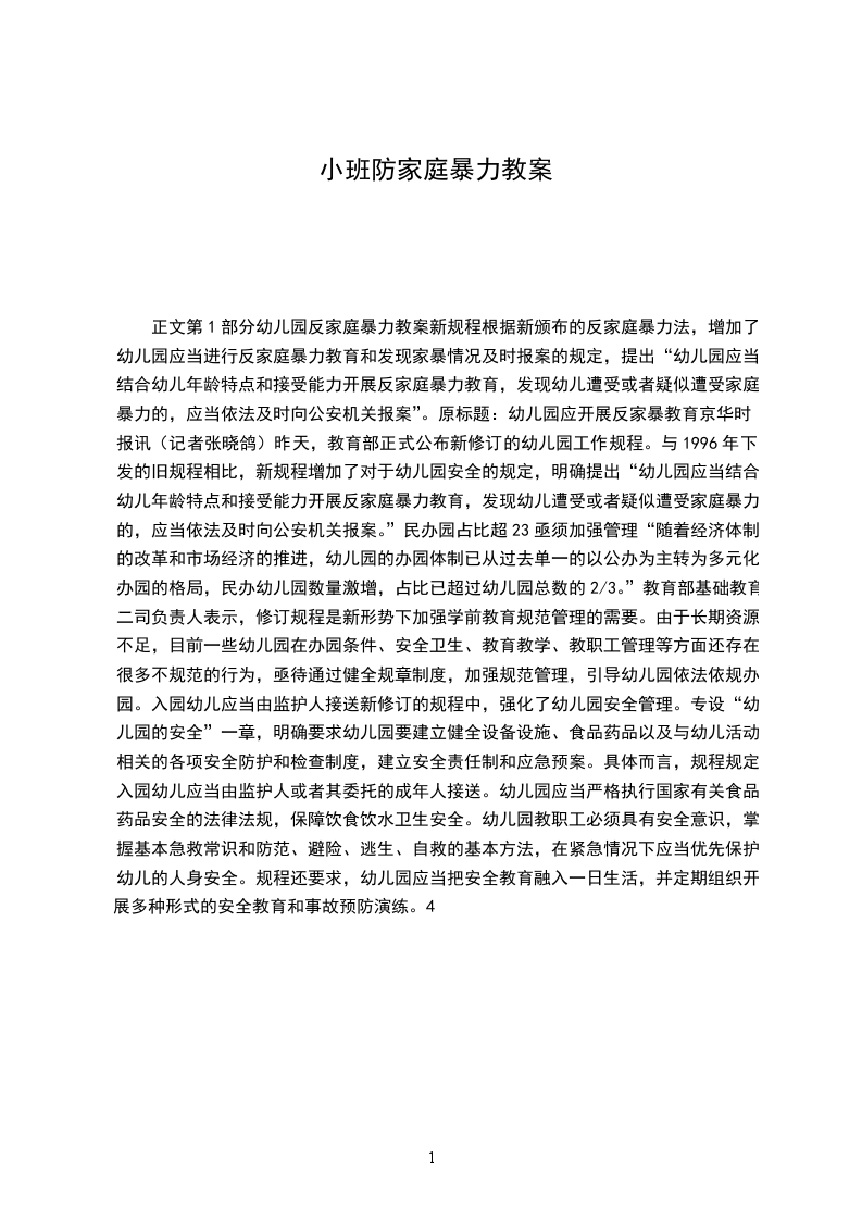 正文第1部分幼儿园反家庭暴力教案新规程根据新颁布的反家庭暴力法,增加了幼儿园应当进行反家庭暴力教育和发现家暴情况及时报案的规定,提出“幼儿园应当结合幼儿年龄特点和接受能力开展反家庭暴力教育,发现幼儿遭受或者疑似遭受家庭暴力的,应当依法及时向公安机关报案”。原标题:幼儿园应开展反家暴教育京华时报讯(记者张晓鸽)昨天,教育部正式公布新修订的幼儿园工作规程。与1996年下发的旧规程相比,新规程增加了对于幼儿园安全的规定,明确提出“幼儿园应当结合幼儿年龄特点和接受能力开展反家庭暴力教育,发现幼儿遭受或者疑似遭受家庭暴力的,应当依法及时向公安机关报案。”民办园占比超23亟须加强管理“随着经济体制的改革和市场经济的推进,幼儿园的办园体制已从过去单一的以公办为主转为多元化办园的格局,民办幼儿园数量激增,占比已超过幼儿园总数的2/3。”教育部基础教育二司负责人表示,修订规程是新形势下加强学前教育规范管理的需要。由于长期资源不足,目前一些幼儿园在办园条件、安全卫生、教育教学、教职工管理等方面还存在很多不规范的行为,亟待通过健全规章制度,加强规范管理,引导幼儿园依法依规办园。入园幼儿应当由监护人接送新修订的规程中,强化了幼儿园安全管理。专设“幼儿园的安全”一章,明确要求幼儿园要建立健全设备设施、食品药品以及与幼儿活动相关的各项安全防护和检查制度,建立安全责任制和应急预案。具体而言,规程规定,入园幼儿应当由监护人或者其委托的成年人接送。幼儿园应当严格执行国家有关食品药品安全的法律法规,保障饮食饮水卫生安全。幼儿园教职工必须具有安全意识,掌握基本急救常识和防范、避险、逃生、自救的基本方法,在紧急情况下应当优先保护幼儿的人身安全。规程还要求,幼儿园应当把安全教育融入一日生活,并定期组织开展多种形式的安全教育和事故预防演练。4