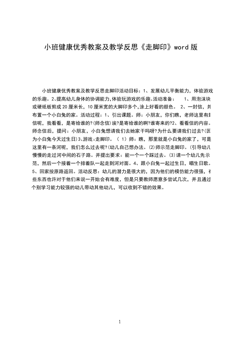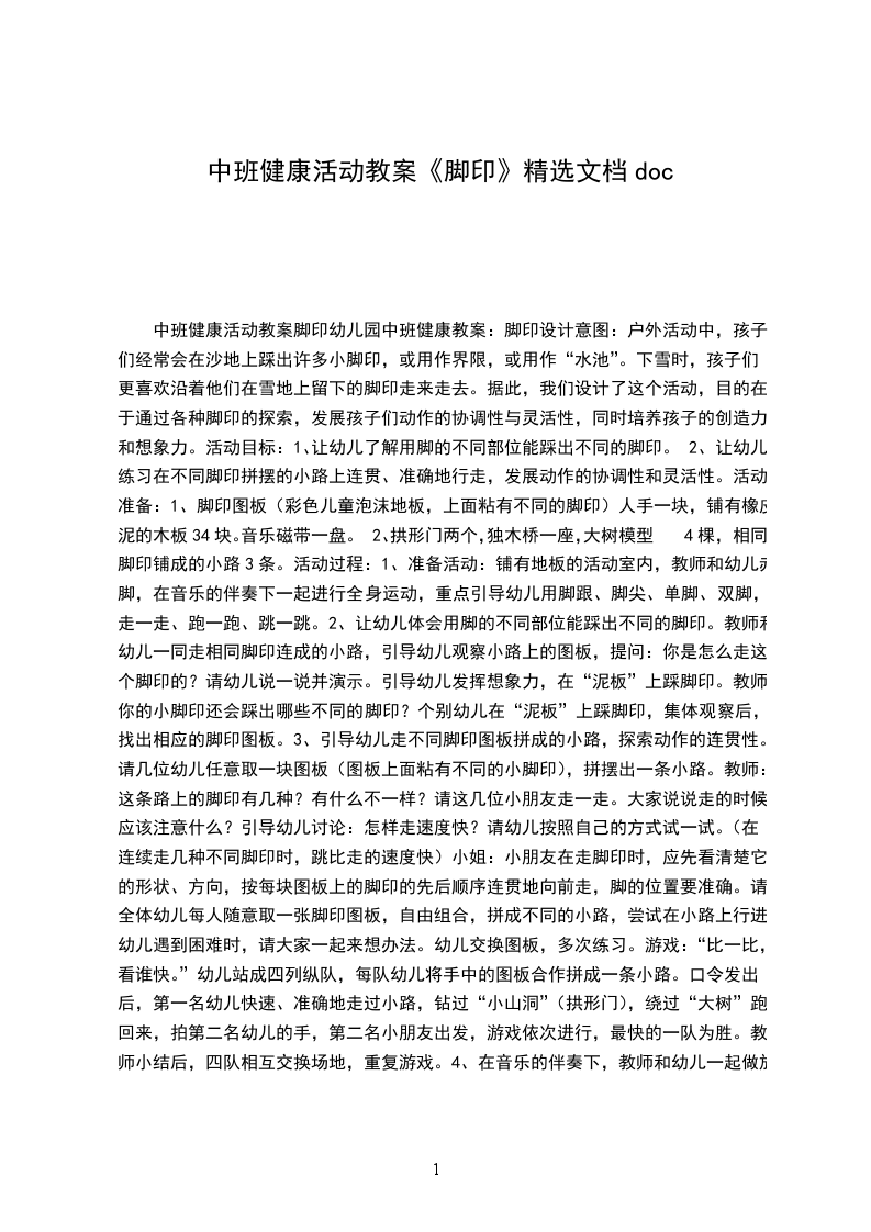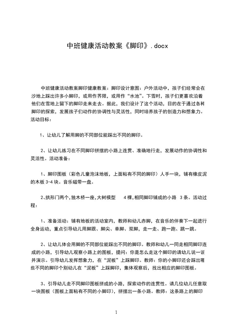 中班健康活动教案脚印健康教案:脚印设计意图:户外活动中,孩子们经常会在沙地上踩出许多小脚印,或用作界限,或用作“水池”。下雪时,孩子们更喜欢沿着他们在雪地上留下的脚印走来走去。据此,我们设计了这个活动,目的在于通过各种脚印的探索,发展孩子们动作的协调性与灵活性,同时培养孩子的创造力和想象力。活动目标: