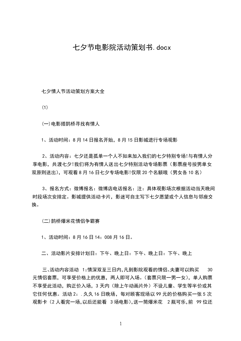 三、活动内容活动1:情深双至三日内,凡到影院观看的情侣、夫妻可以购买30元情侣套票,可享受价格上的优惠,两人即可入场。(套票只限一男一女),单人购票不享受此活动,购正价入场,3天内(除上午动画片外)不设儿童、学生等半价或其它任何优惠。活动2:.久久16日晚场,每对顾客现场以99元的价格购买一张5次观影卡(2人看完一场,以后还能看3场电影),送一筒爆米花 2瓶可乐,前99位还可获赠一支玫瑰花,还有机会获得其它小礼品。活动3:真情心语16日当晚,所有观看电影的朋友可在我们在影院设置的示爱宣言板上,写下你们的爱情宣言、美好愿望。