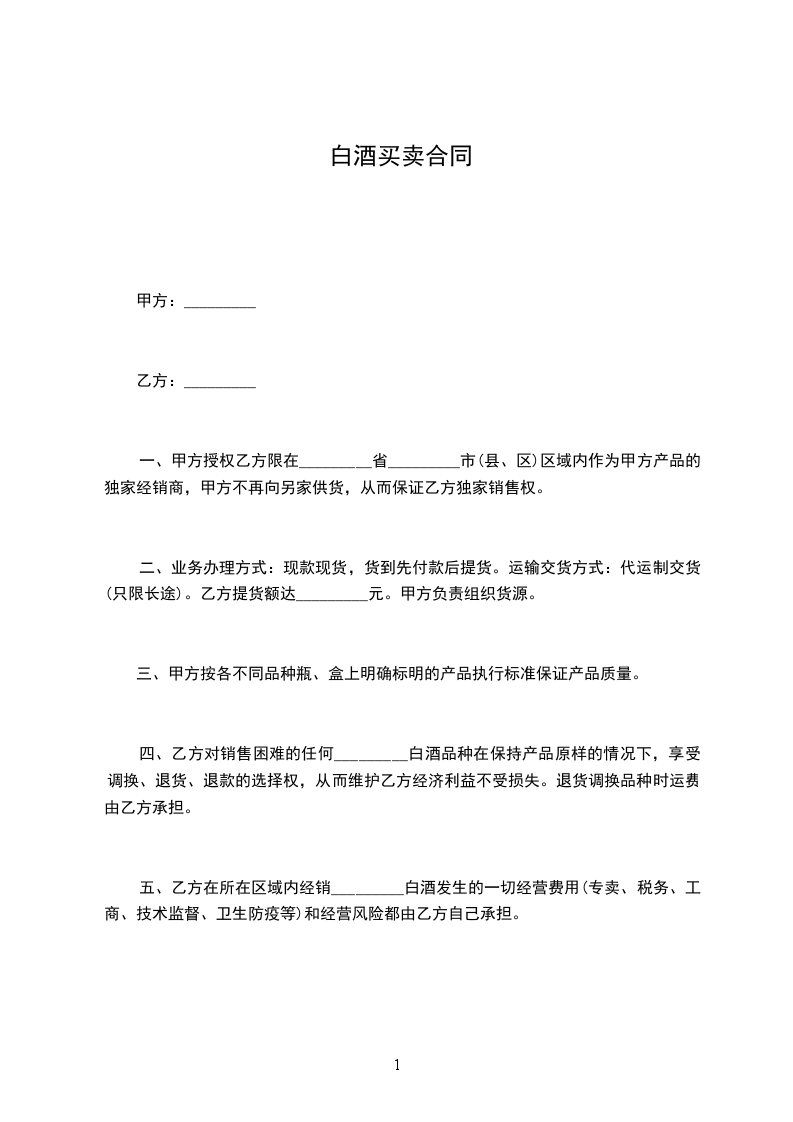 五、乙方在所在区域内经销_________白酒发生的一切经营费用(专卖、税务、工商、技术监督、卫生防疫等)和经营风险都由乙方自己承担。