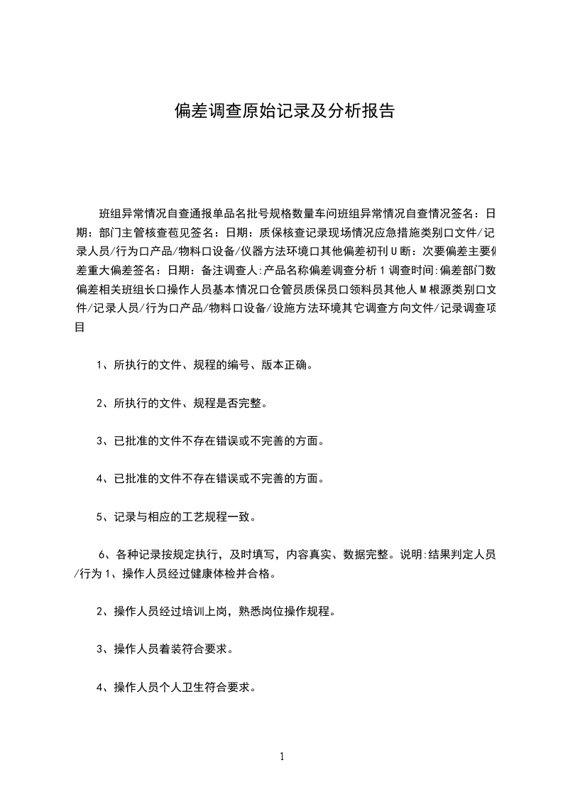 9、操作间生产完有及时清场且检查合格。是否无关说明:回顾从未发生过相关的问题;产品稳定性考察也未出现过异常情况;其它方面未出现过不稳定因素。是否无关说明:其他方面无调查结论偏差分类口对产品质量无影响,为次要偏差。口会对产品质量产生实际或潜在的影响,为主要偏差。需采取措施纠正。口会对产品质量、安全性、有效性产生严重后果。为重要偏差,需采取措施纠正并预防再次发生。风险评估对广品的质量是否有直接影响:口是否纠正及预防建议建议:预防建议:备注